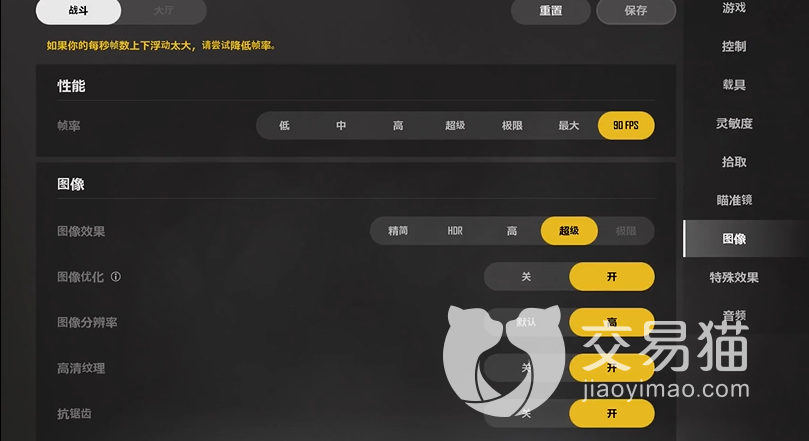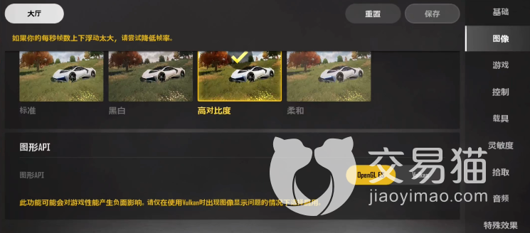 设备性能较好的玩家可以先把帧率调到最高,然后画质效果选择高级,打开图像优化,分辨率也要高,高清纹理和抗锯齿也可以拉满,接下来选择高对比度,图形API选择下图所示的选项。