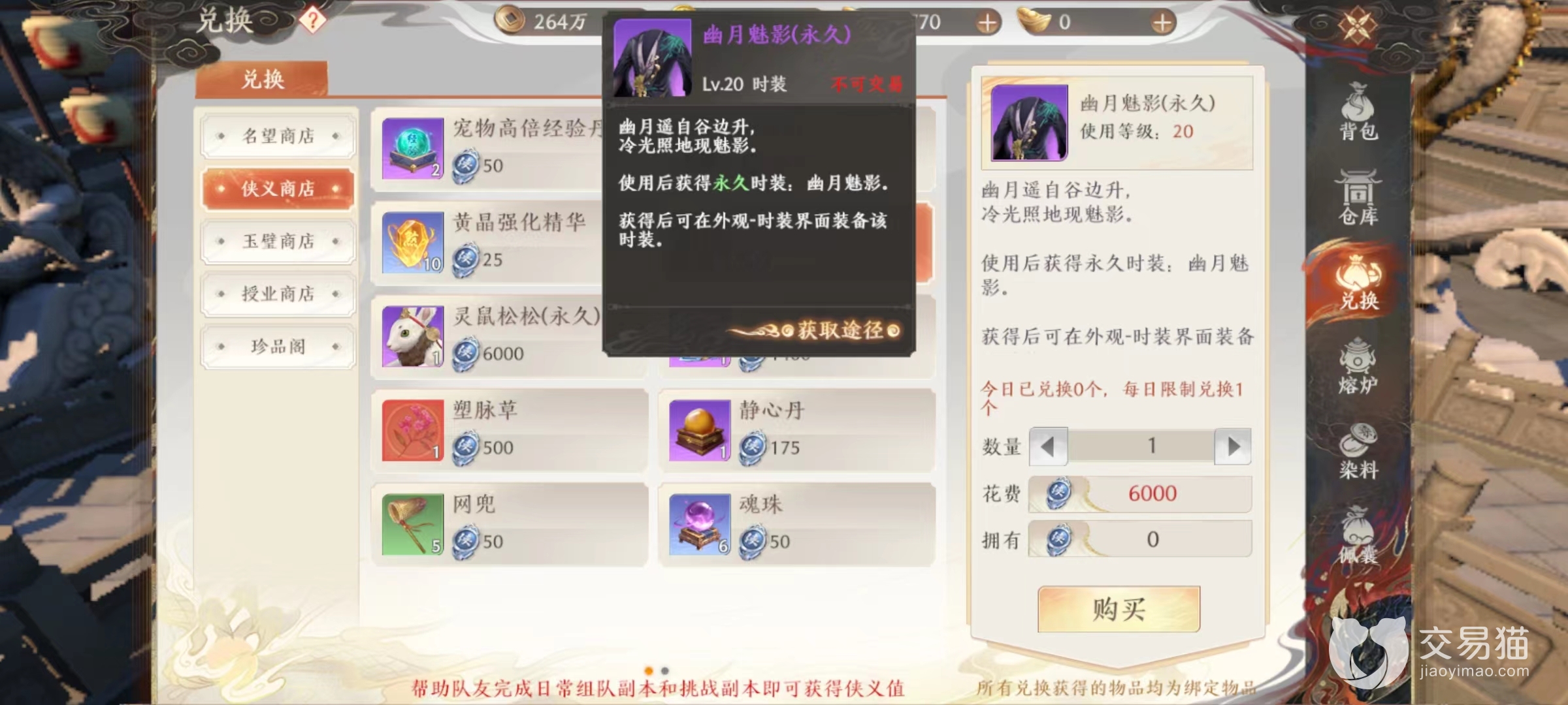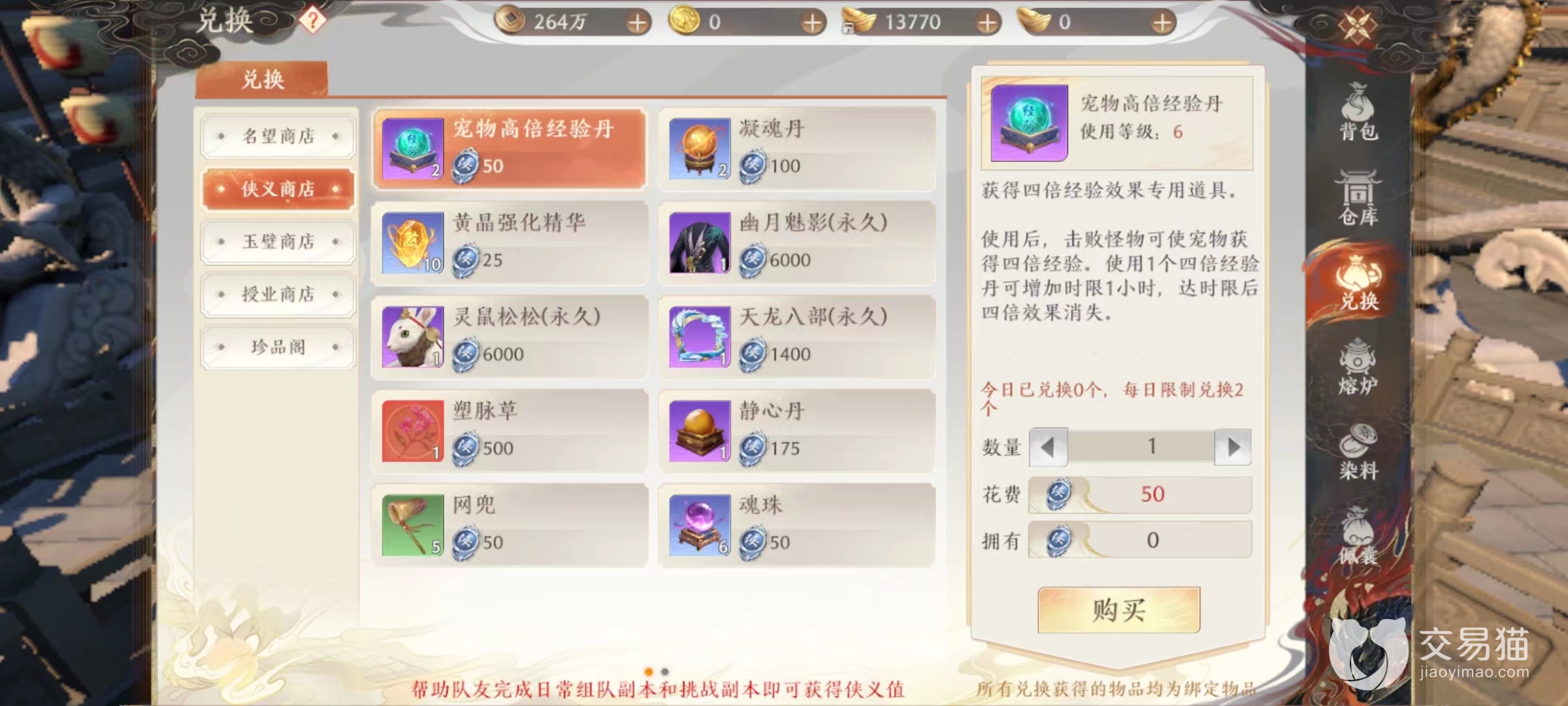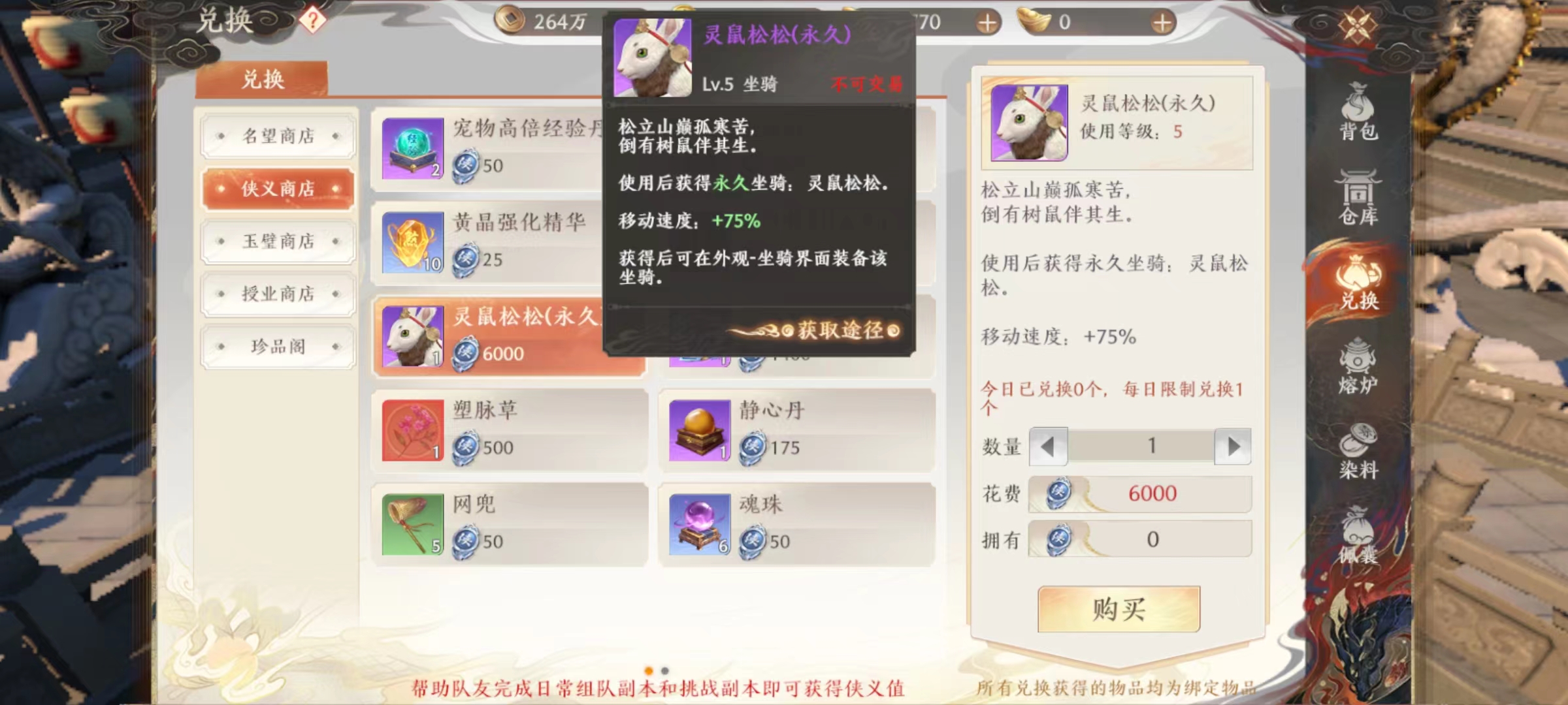 这里还有坐骑,获取门槛比较低,积累6000侠义值就能拿到手。接下来如果还有剩余可以兑换些静心丹,这是预防不小心PK之后消除罪恶值使用的道具。