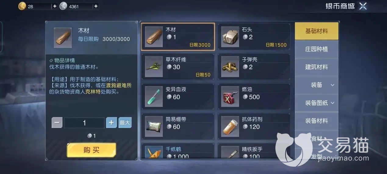 划分标准有品级高低和使用途径,我们这里综合两个参考标准,按每种使用途径中从低到高进行分类,方便大家参考物资的作用和可能的获得方法。首先我们可以在物资商店里买到的,都是最基础的物资。其中木材石头和草木纤维最常见,用途也广泛,打造采集工具、篝火,建造房屋和设施都要用到它们。
