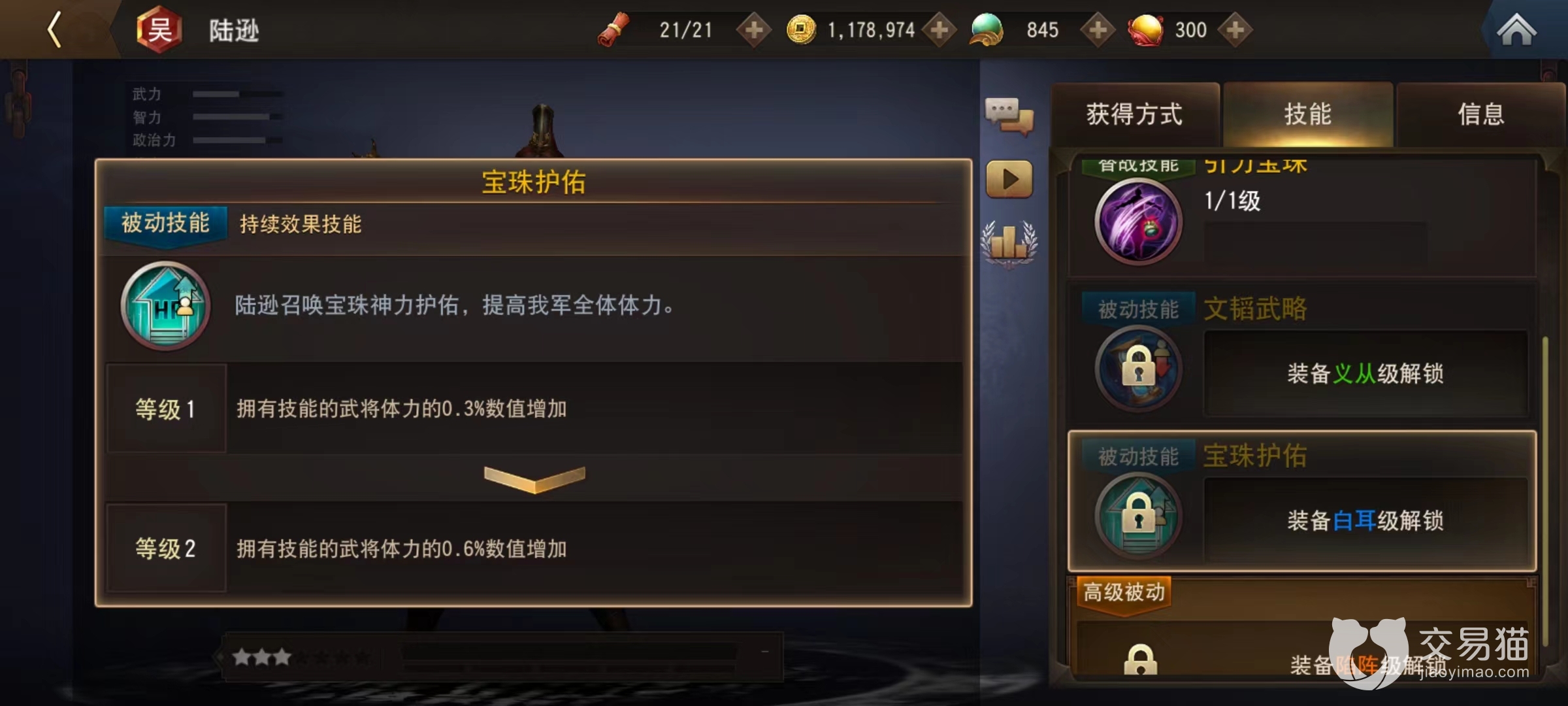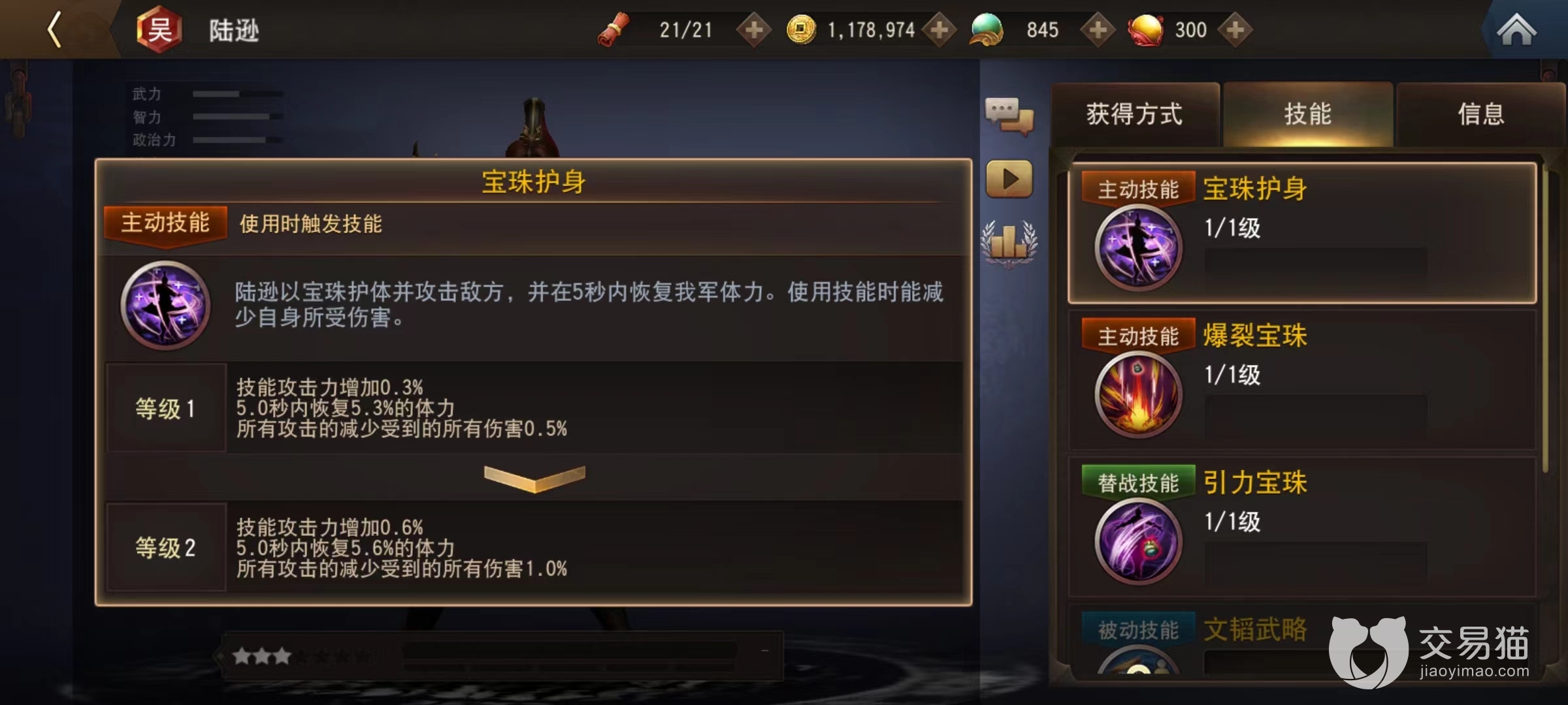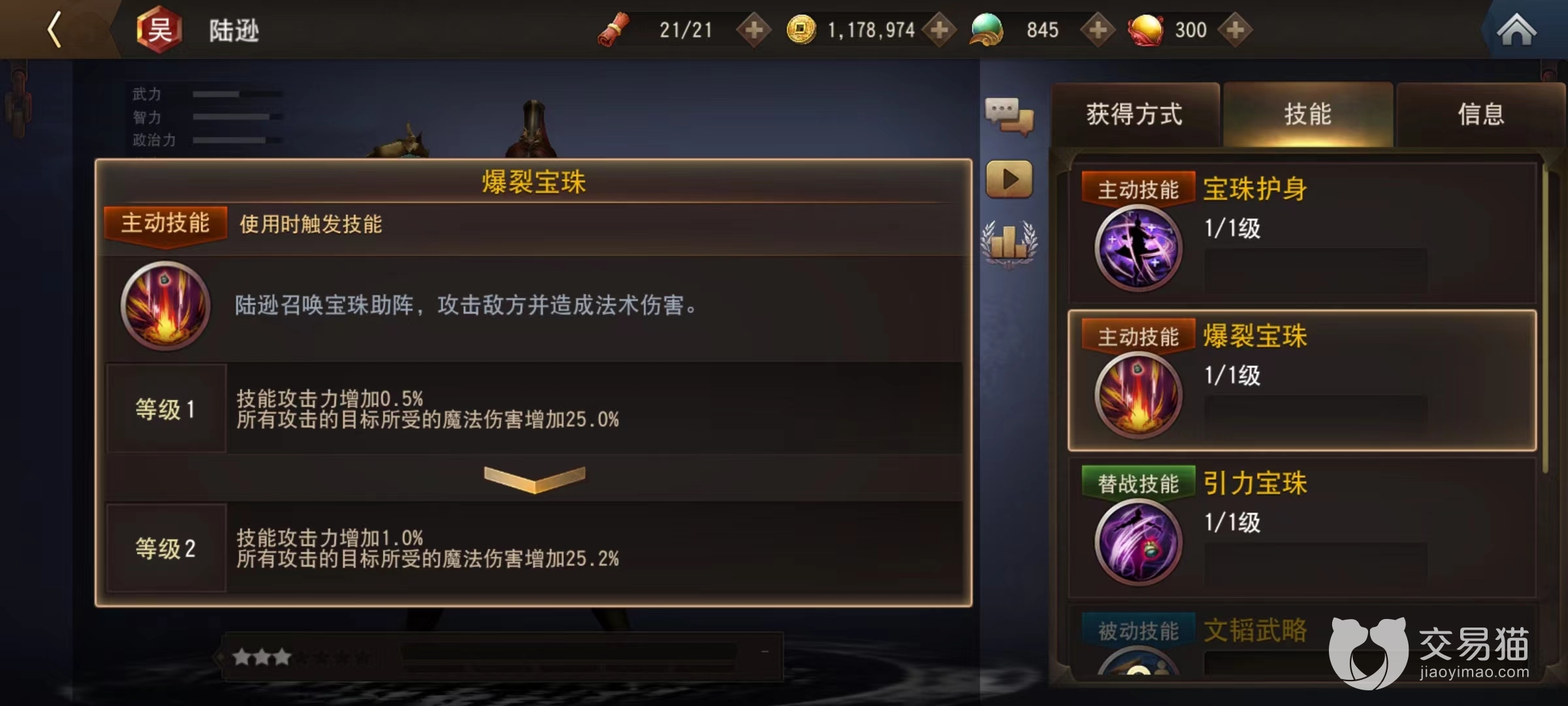 很多玩家认为陆逊初始只有三星肯定不能承担起核心重任,其实这样认识不正确,不论初始星级如何,只要后期养成到位都可以在属性上做到一致,最关键依然看技能效果,这是无可改变类型。陆逊所拥有两个主动技能分别是伤害和治疗效果,第1个宝珠护身,在5秒钟之内为我方目标恢复大量体力,并且在技能释放时候还能减少自身受到伤害。第2个爆裂宝珠,召唤出宝珠攻击敌方,造成大量法术输出,这样综合起来既有团队辅助又有伤害。