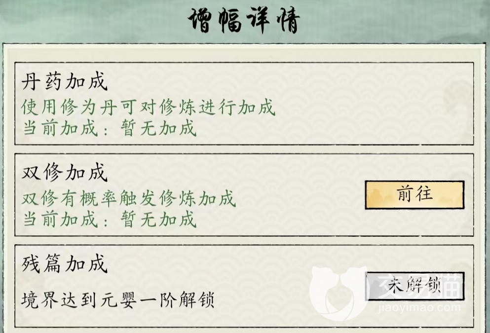 门派传承这是些比较强力门派才能获取的必要,当学习传承之后直接解锁,对于修炼帮助很大。道侣加成是在获取红颜之后相互之间结成道侣,就能永久提升。其他类型还有秘法、法宝、镇魂塔等内容。秘法分为清虚,混沌,黄泉,无名书卷等,每次修炼都能额外增加修为,属于固定数值提升。这些详情都能在修炼过程中直接查看到,而且对应加成和当前修炼速度也都有非常清楚展现。