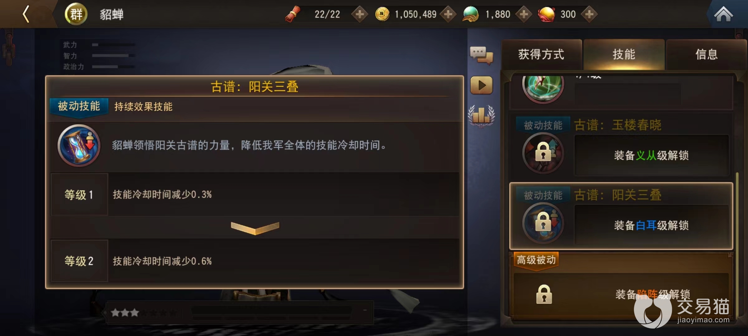 两个被动同样是团体辅助能力,第1个提高所有人的技能伤害,第2个降低技能冷却时间。相比于伤害提升,小编依然认为冷却时间降低更加关键,可以显著提升整体节奏,尤其是对于一些强力近战武将来说更是如此。所以貂蝉在搭配上也深受玩家喜爱,与吕布,董卓等这样强势人物一起出战,非常好用。