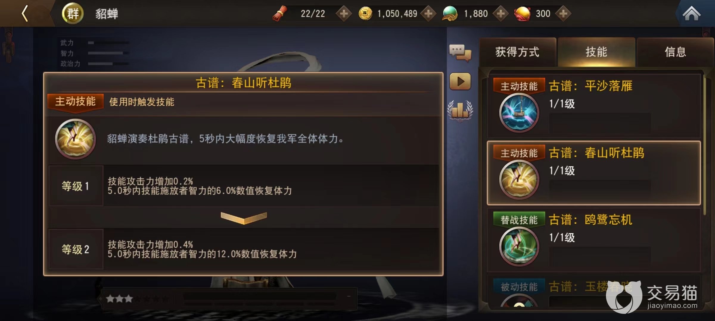 第2个主动技能是辅助效果,使用之后在5秒钟持续时间内大幅度恢复我方全体武将体力值。具体恢复数值和技能等级以及智力相关,好在拥有极高智力属性,所以在加血量上值得信赖。当替补出战时候只要登场就能降低全体受到的物理伤害,并且对敌方全体输出。从这两个技能效果来看,绝对是当前辅助能力最强一个,而且输出也不弱,最佳使用依然是替战登场。