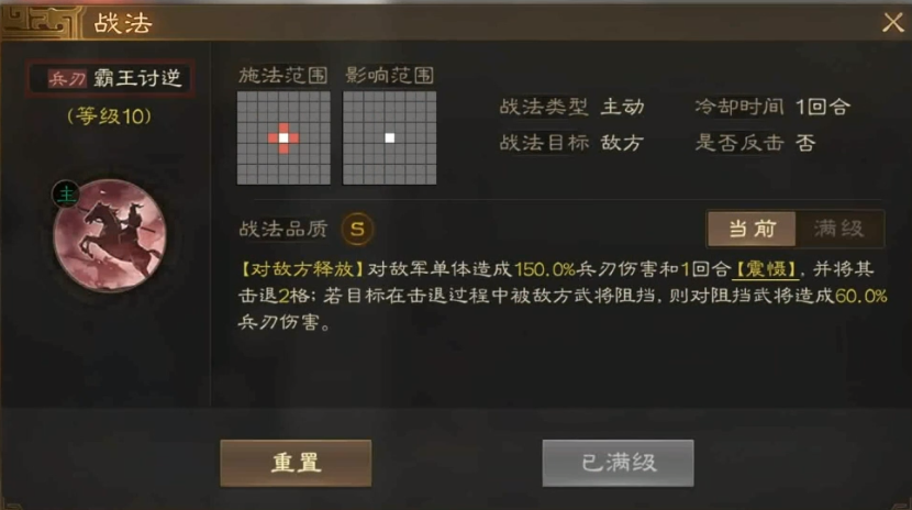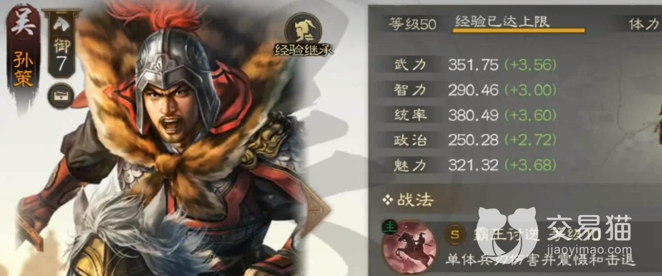 只有知道这个武将的技能是怎样的,才能助我们更好地上手。孙策的主要战法是霸王讨逆,是非常强大的控制技能,可以直接将敌人击退两格并造成一定的伤害。所以该武将可以放在前排,用来阻止敌人的前进。