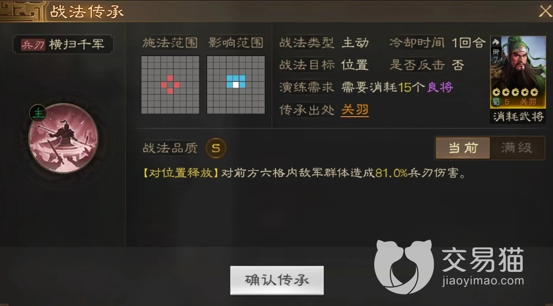 除了自带的战法之外,还有传承战法,是一个输出型的技能。使用后可以让六格内的敌人造成百分之八十一的伤害,拥有不俗的输出,令人感到闻风丧胆。