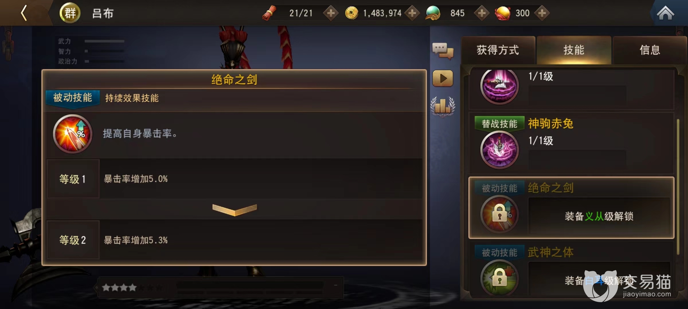 两个被动没有特殊效果,但都极其实用,绝命之剑直接提升自身暴击率,武神之体是在触发暴击时候有几率恢复生命值。被动强化了输出,吕布本身暴击就非常出色,在获得几率上提升更是刀刀见血,而恢复生命值特点是让陷入到重围之时不依赖其他恢复也能持续战斗。
