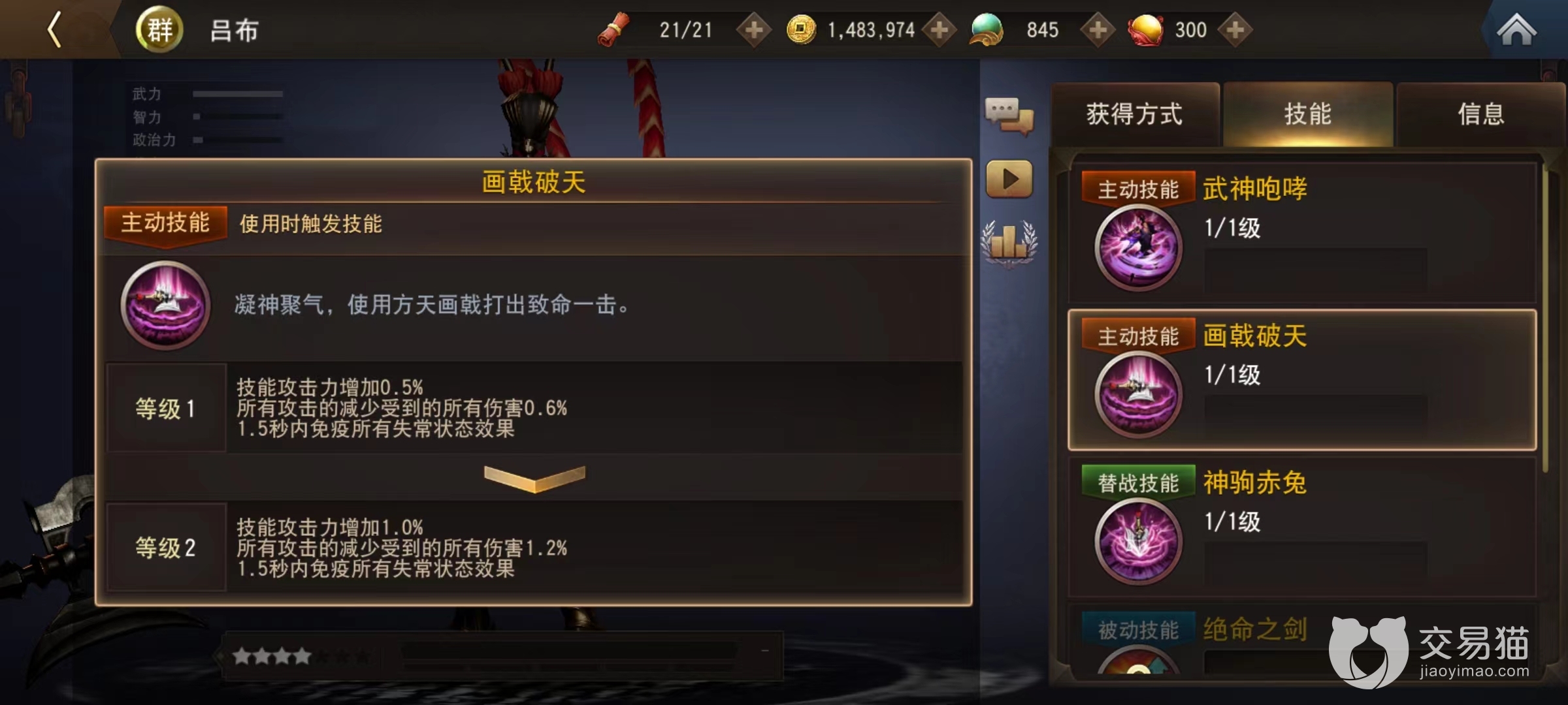 武神咆哮可以将周围敌人拽到自己身旁,并且造成物理伤害,这一步是为了将周围零散怪物全部聚集到一起,方便使用接下来的画戟破天打出致命一击。不仅攻击力高,而且在使用之后的1.5秒内还能使自身免疫所有异常状态,即使面对比较复杂boss也能轻松击破,不会受到各种失常状态影响是最大优势。替战效果也同样非常炫酷,从赤兔马上跃下对范围内敌人造成伤害和眩晕,所以完全可以将这一效果利用起来,先让其他武将登场,清理小怪攻击boss时再换上吕布。