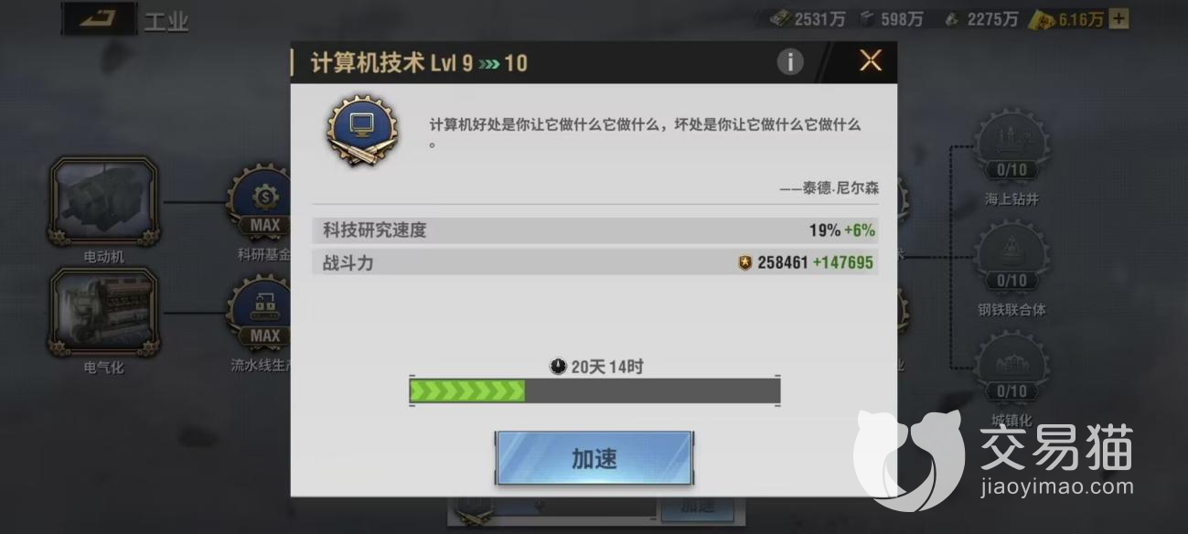 5、如果可以提升科技的速度,那么研究其他技术的时间也将加快。如果计划升级多个科技,则需要首先升级此科技,这个的收益是非常高的。
