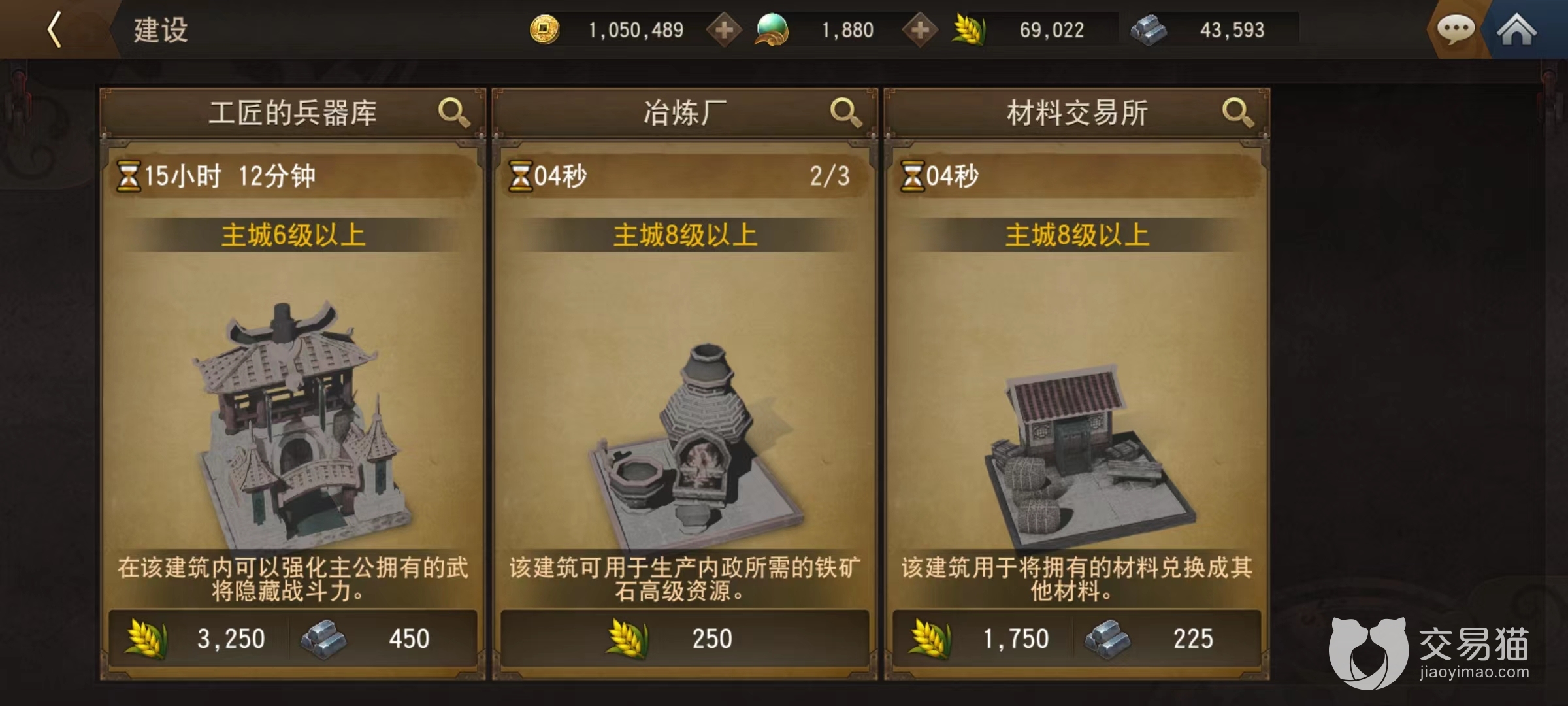 综合起来也就是两点,第一是尽量多建造铁厂,第二是不断扩建升级。另外在生产时候也可以选择政治力高角色,这样最终生产效率也会有提升。最后一项途径是在主城达到8级以上可以建造材料交易所,这是用于兑换的建筑。用多余资源去换取缺乏资源,例如粮食比较多,就用它来换铁矿,也是常用途径。