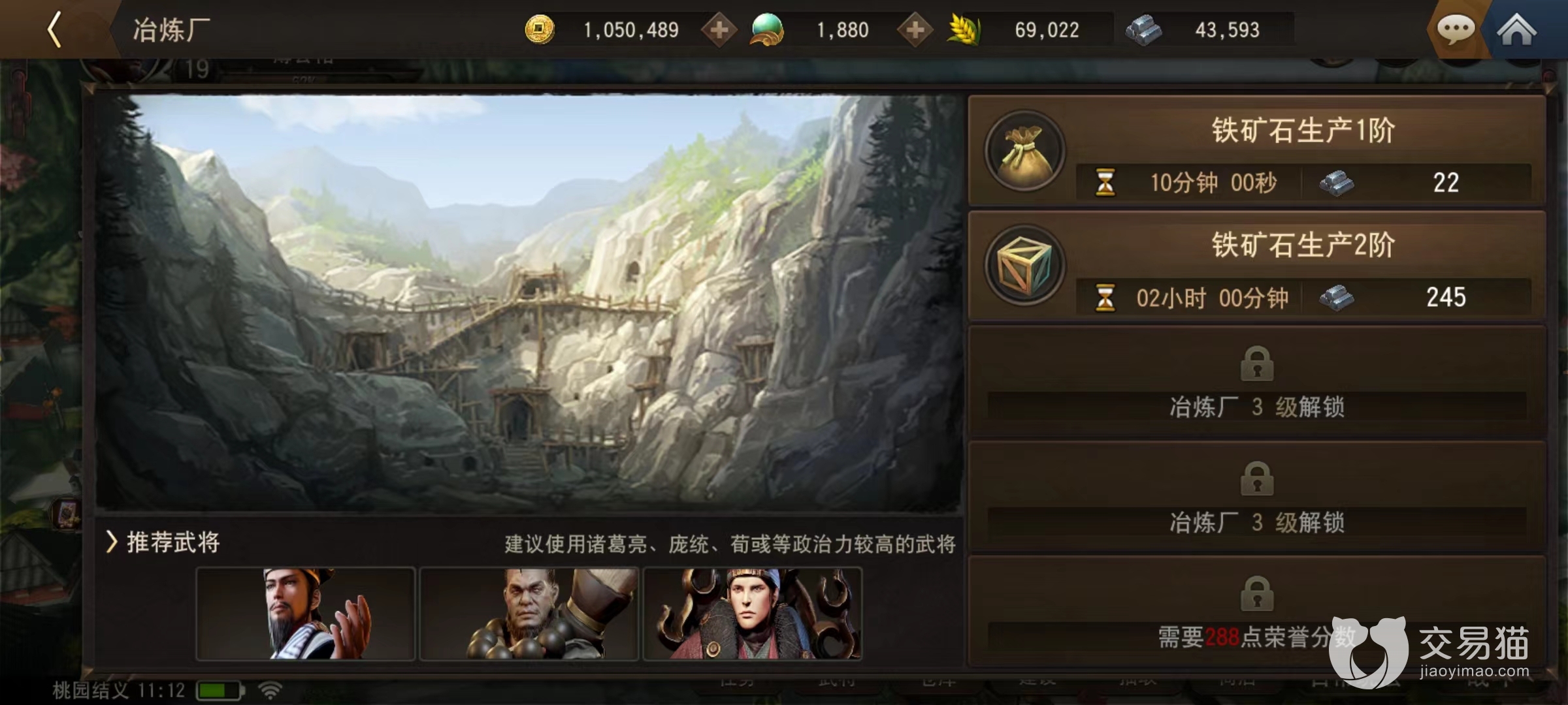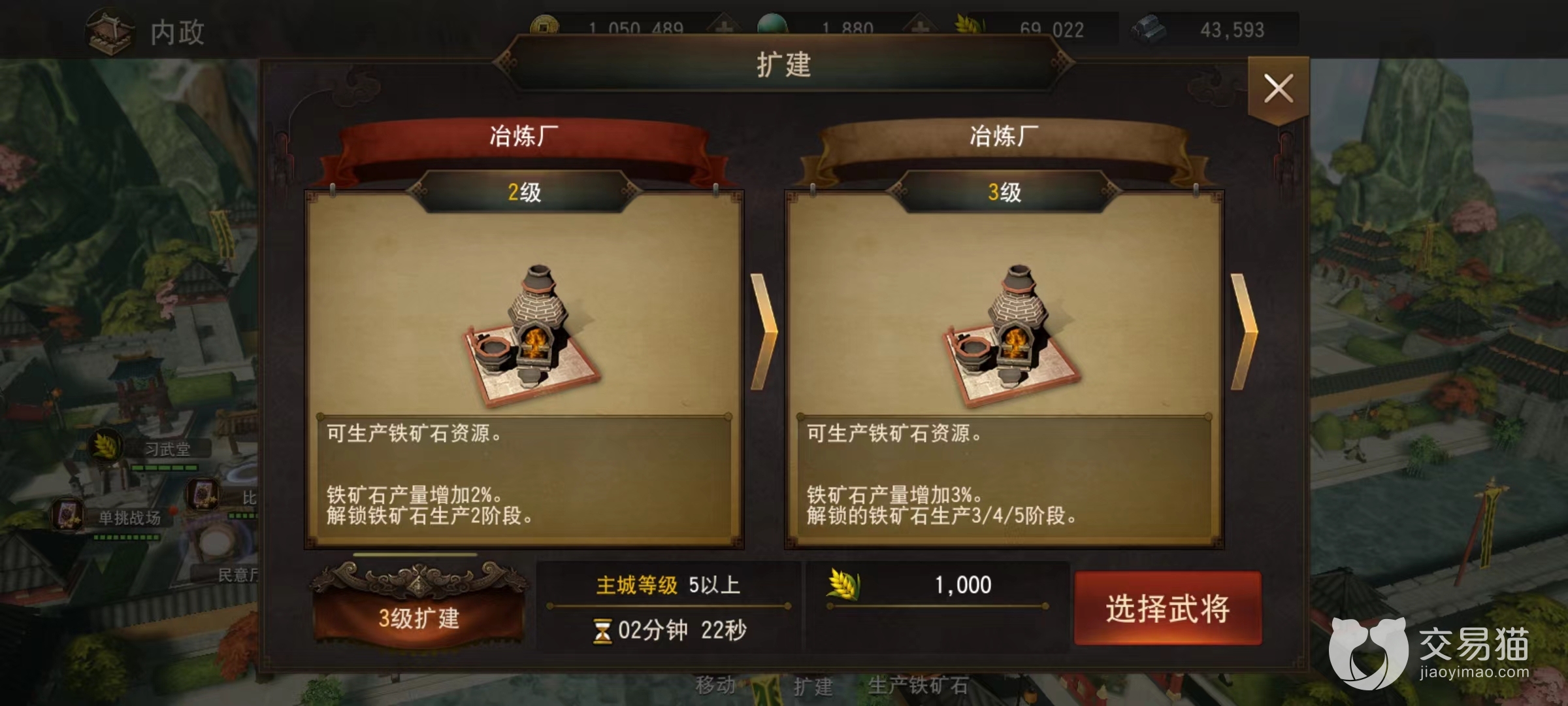 铁矿石获取主要途径就是在主城中自己生产建造,最关键建筑就是冶炼厂,通过不断升级主城,能够建造更多冶炼厂。建造完毕后会发现有两个不同的功能,分别是扩建和生产铁矿石,点击生产之后发现有不同阶段,不断升级建筑等级能够解锁更高阶。目前一共有5个阶段,前4个都可以通过升级来解锁,但最后一个要利用荣誉分数才能激活。
