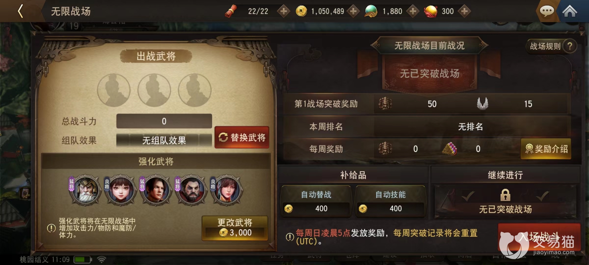 有关羽翼需要介绍方面有很多,首先就是装备条件,并不是所有武将都可以穿戴,必须当装备等级强化到白耳以上才能佩戴。装备强化大家就比较熟悉,只要前期跟随主线不断推图适当进行扫荡,强化到白耳并不算困难,接下来就是要收集相关道具。和其相关的只有去无限战场活动中参加战斗,获得相关铸币之后才能购买。无限战场要在自己主城中建设好相关建筑,而后点击进入战场开始战斗。