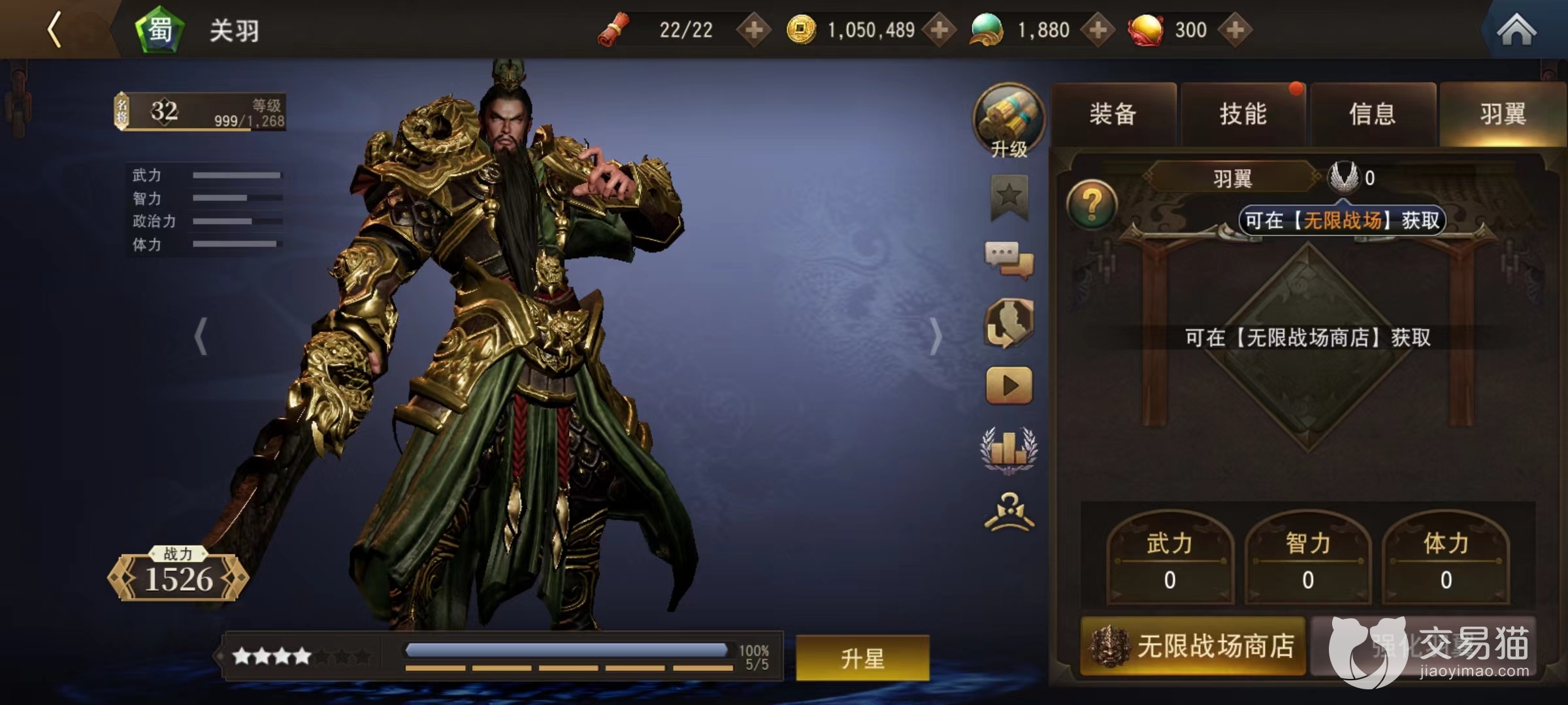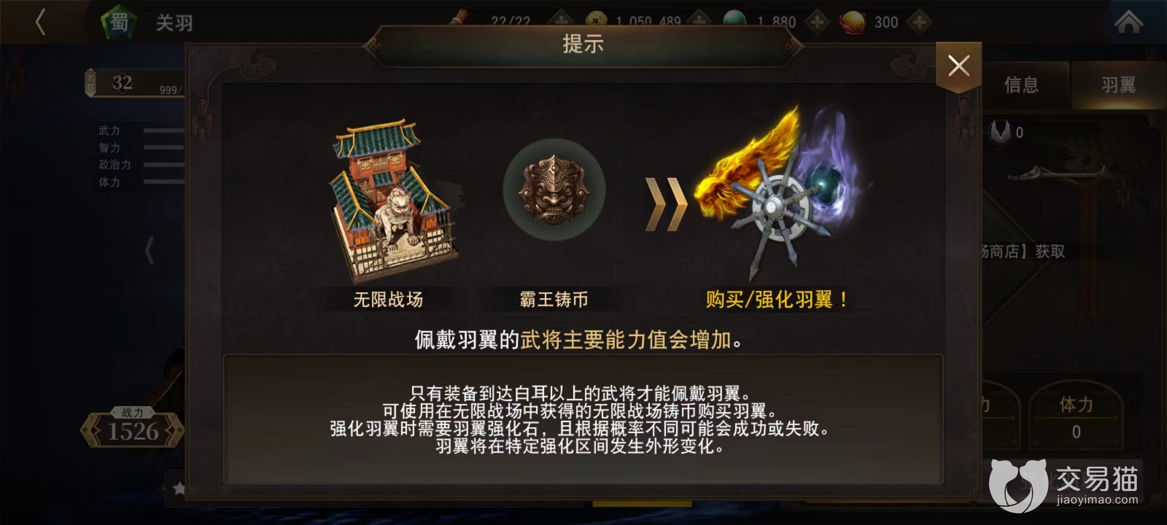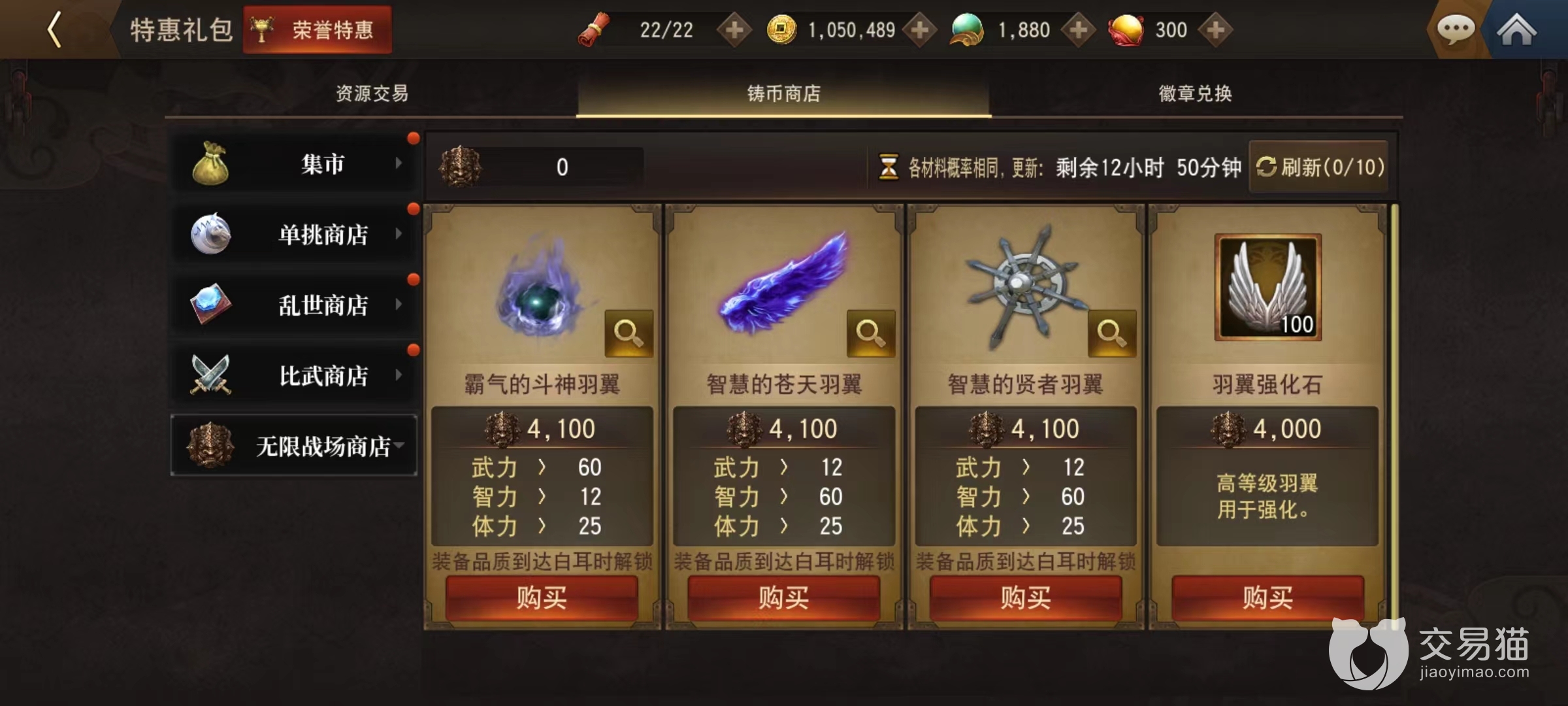 战场规则也很容易理解,每天都会在凌晨5点重置,根据获取积分排名以邮件形式发放奖励,选择手中最强悍的5名武将让其获得强化,就可以愉快去战斗了。在获得铸币之后,同样是在无限战场建筑中有专用商店,点击进去后就能发现羽翼相关产品。目前有三种不同的类型可以选择,分别是斗神,苍天和贤者,对应武力,智力属性。其中苍天和贤者都是提高智力,只有斗神增加武力值,根据武将具体需求选择合适装备上。