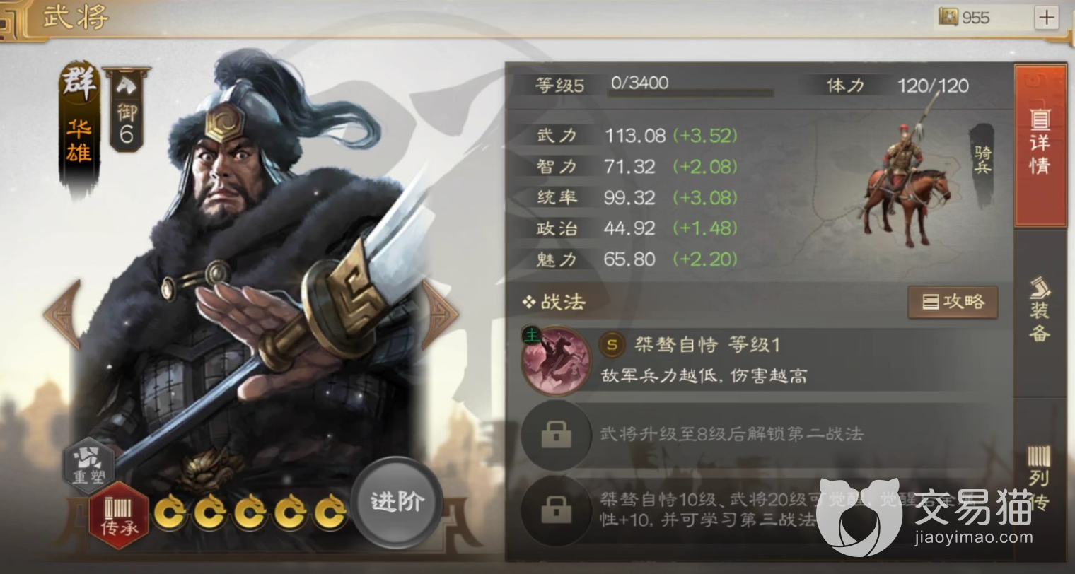 ①华雄:这是一个前期开荒非常强力的角色,他本身的属性无论是武力还是统率都有着较高的基础数值和成长数值,所以完全可以直接承担带四张紫卡开荒的重任,并且值得一提的是他的战法简单粗暴,不仅有着单体高伤,还能通过击杀来刷新cd,无论是配合aoe爆发队,还是配合均衡队或控制队都能打出亮眼表现。