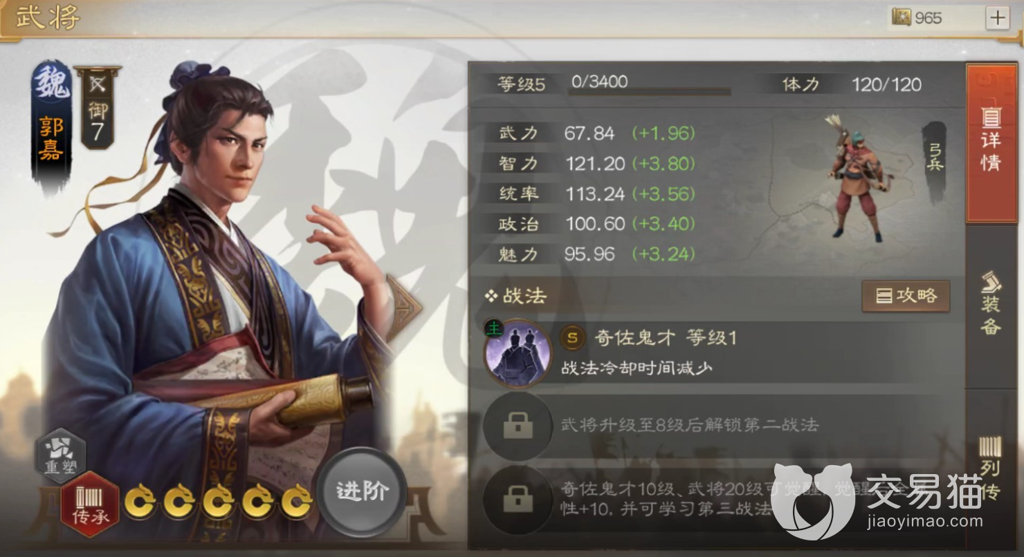②郭嘉:这是后期的法核型武将,虽然其自带战法的伤害数值并不算高,但他的被动却可以给所有战法提供额外的伤害和治疗加成,并且还能减少它们的冷却时间,所以只要能够培养到后期,拥有三个战法的郭嘉将直接化身法术机关枪,如果能再配上一下可以增伤的队友,这个效果会更加明显。