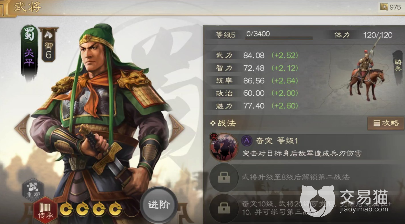 关平作为一个近战型的武将,可以搭配弓兵一起使用,他属于紫卡,所以基础属性比起橙卡会稍弱一些。最大的特色是他的武力值和统帅值很高,所以是个防御攻击都比较突出的武将。此外,他还是蜀国的一名大将,搭配上其他蜀国武将的话,可以玩得更好。