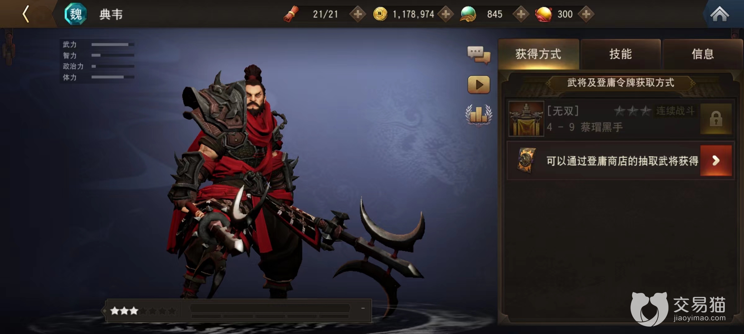 对于一名初始三星角色,武力值和体力能够达到典韦这样数值已经非常可观,接近满值水准,使其在防守和进攻方面不虚与其他顶尖角色。第1个主动技能是向前方投掷出手中大斧子,造成巨量伤害后所有目标都被减速1秒钟。减速时间相比于其他角色施加的效果略微短些,只能起到稍微停滞对方走位作用。