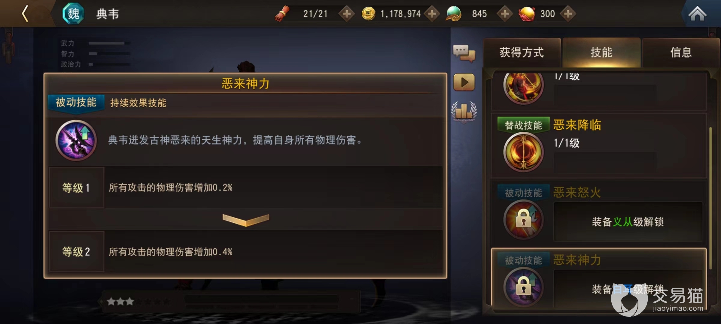 被动都是提高伤害,这在所有武将中也是很少见的效果,第1个恶来怒火,将心中怒火释放出来,提升自身暴击触发时所打出输出,第2个恶来神力,自身造成所有物理伤害都获得提升。这两个技能叠加起来让典韦输出变得更加狂暴,而且没有其他任何附加效果,直来直去非常简单。没有其他额外附加也就意味着阵容组合上极其简单,不局限于魏国阵营,如果真正想要获得额外附加,小编建议是与曹操、许褚一起出战,这样能够提升体力和暴击减伤效果。