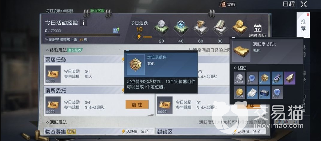 首先来了解一下定位器获取方式,通过其他活动只要能获得10个碎片就可以合成为定位器,碎片获取方式主要有每天任务活跃度奖励在宝箱中就能开出来,随着角色等级逐步提升,里面奖励内容还会更加丰富,总体来说只要每天坚持登录游戏做任务,肯定可以稳步获得。此外还有一项需要去争取的途径,就是在每周任务中参加空投争夺或是油气争夺,在这两项活动中都有机会得到碎片。积攒够碎片之后只要点击合成就能自动组合完毕。