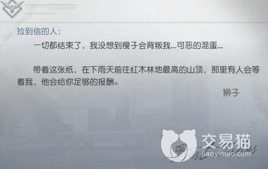 当大家打开街头密信之后就可以看到一串谜语人一样的发言,从信件中的谜语人发言中可以获得一个信息,那就是玩家需要带上纸条在下雨天前往红树林最高的山顶,之后玩家带着这封信件来到山顶后找到一个名为狮子的npc,和他对话之后就可以完成任务了。