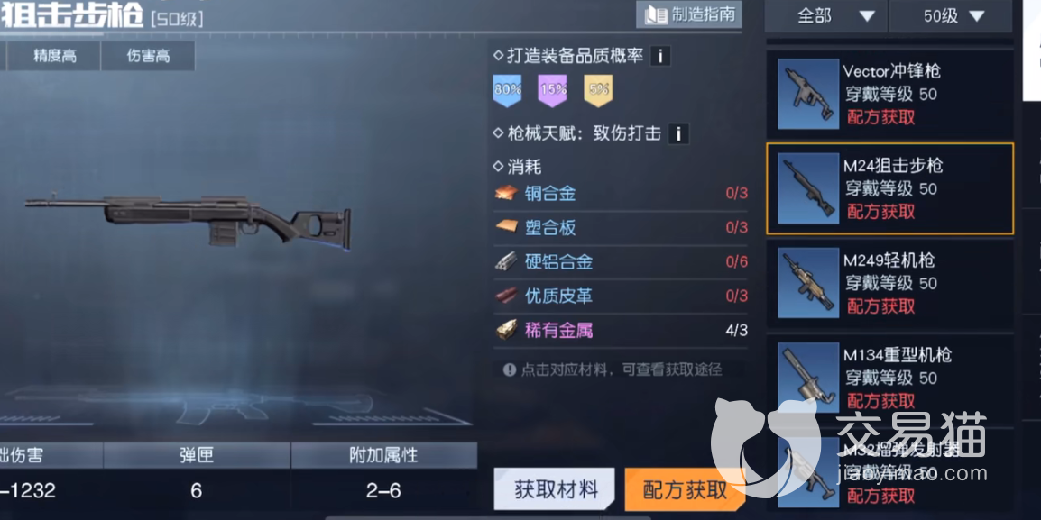 任务解锁之后,我们需要给npc一把指定武器,比较难获取的资源,我们这里推荐在高级地图,红木林地周边收集矿石、棉花等资源。枪械大师的经验值来源于制作枪械。