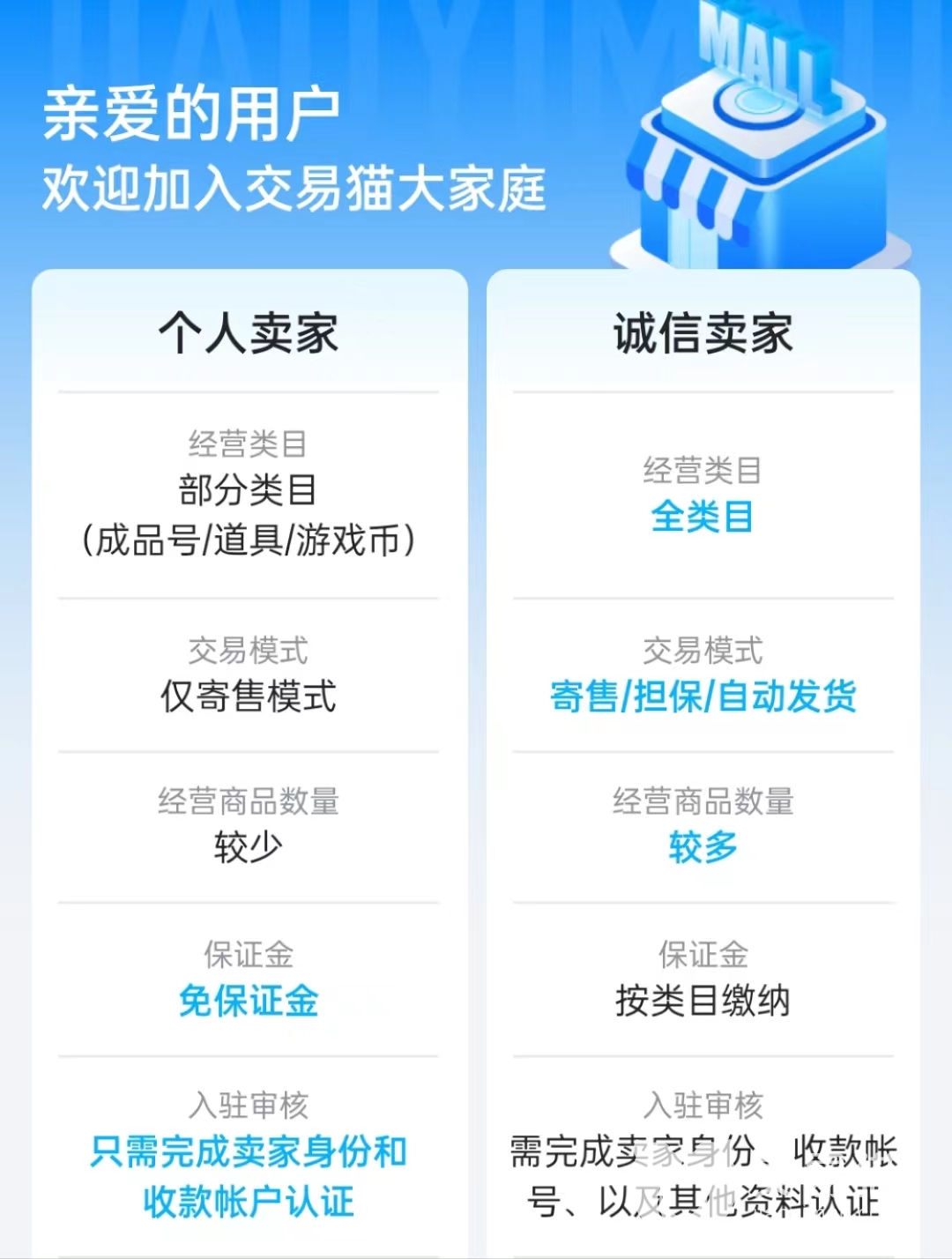 在交易猫这个平台上成为商家很简单,不会有繁琐的步骤,小伙伴们只需要在交易猫我的页面点击成为商家,进入页面后会发现卖家有个人卖家和诚信卖家这两种,后者拥有更多的交易功能和服务,小伙伴们可以根据自己的需求去挑选成为什么样的商家。完成后,我们只需要根据引导填写游戏账号信息,就可以完成账号的上架了,非常的简单。