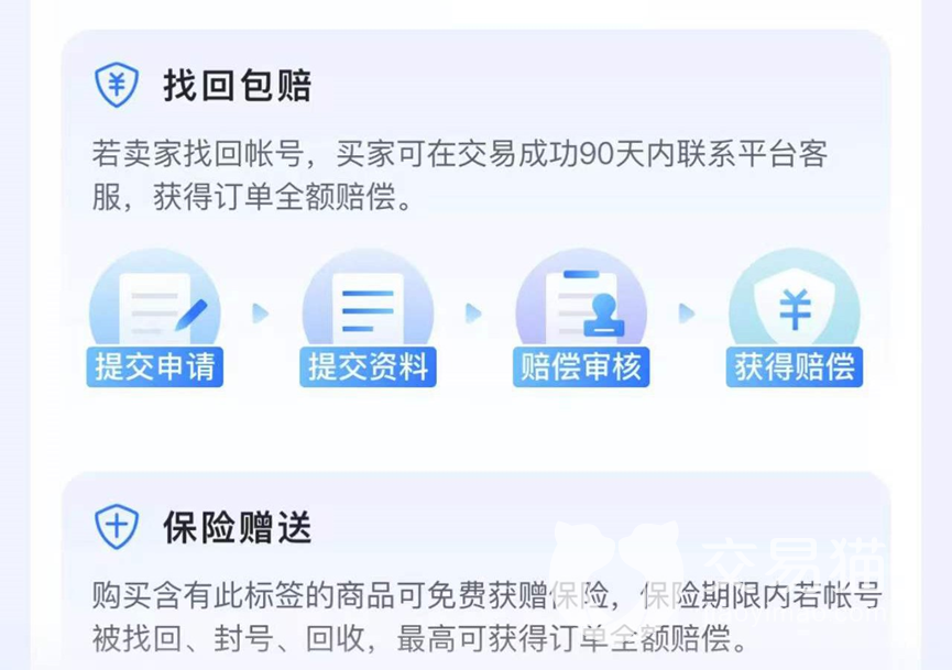 除了减少买卖家的接触,交易猫还有一个交易险的机制,为了防止买家的账号被卖家恶意找回,每次交易时平台都会为卖家进行投保推荐,并且对于部分商品平台还会做到找回包赔,这样就算你的账号被找回了,平台也会包赔并且追查卖家还买家一个公道。