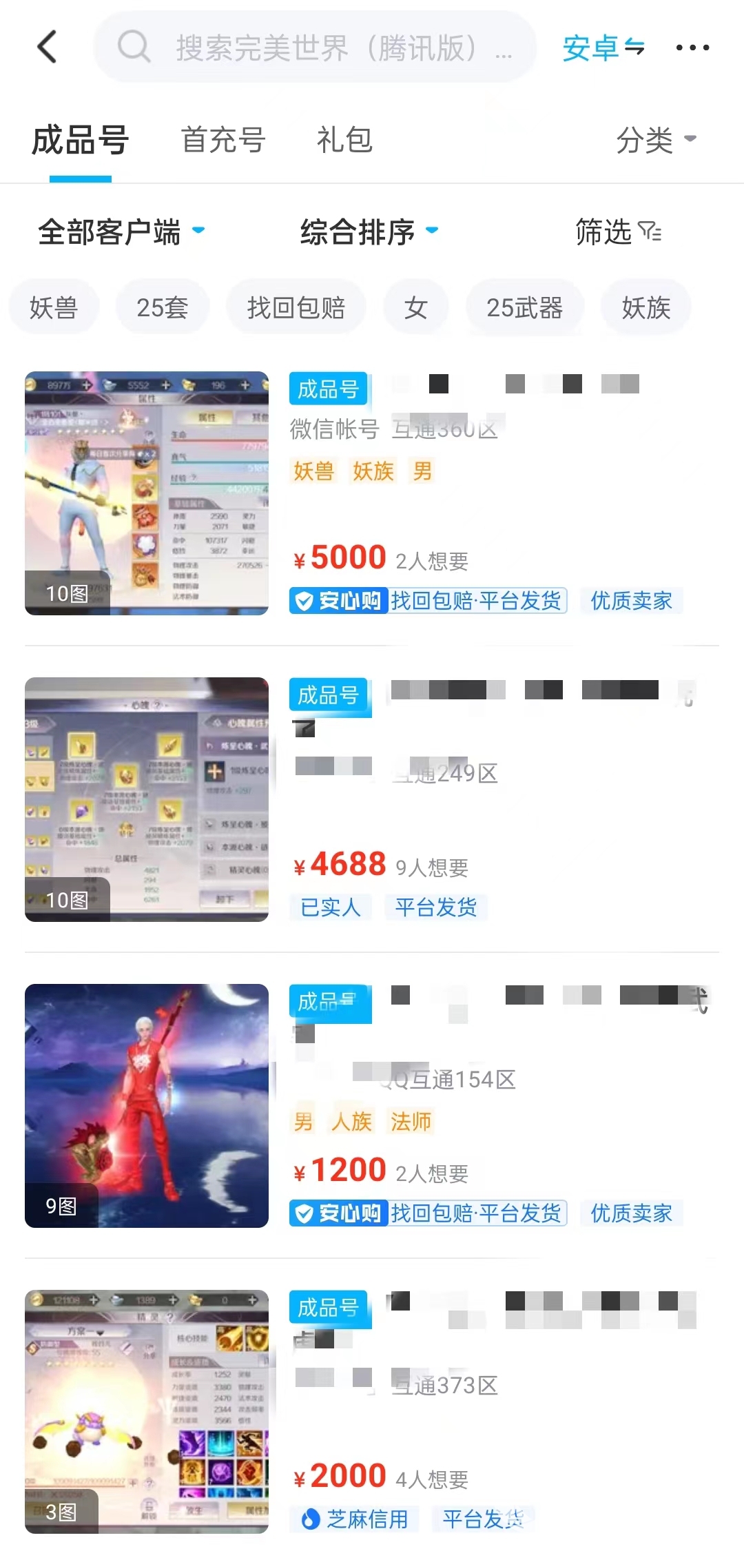 小编之所以推荐交易猫,首先是因为交易猫中完美世界账号资源非常的齐全,无论是高氪的成品号还是中氪的半成品养成号在里面都可以找到,同时价格也非常具有性价比。我们只需要在首页搜索完美世界手游就可以进去专区,所有完美手游账号都会呈现在我们面前,小伙伴们也可以根据自己的需求去筛选价格、装备、妖兽、等级等等,可以快速的找到自己想要的账号。