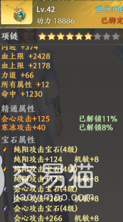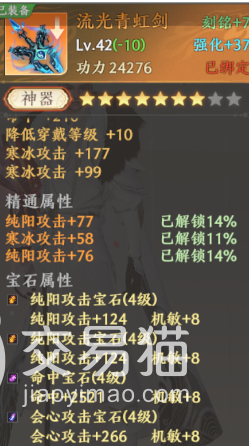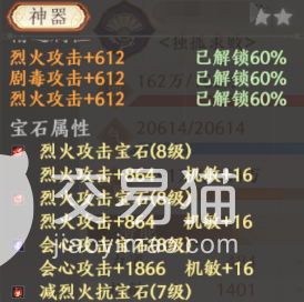 这里给大家举例子,拿游戏中的几件不同的攻击神器来说,首先是浮纸扇,这件神器大家应该不陌生,她的基础属性主打的就是火毒攻击,所以后续的打造也需要围绕这几个属性展开,首先就是宝石,宝石是打造中非常重要的一环,宝石可以提高大量的属性,对于这件攻击神器的宝石,这里按照她的属性给到了两个8级烈火宝石和一个8级会心宝石家一个7级火抗宝石的搭配,这套配置可以完美契合门派属性和装备属性。