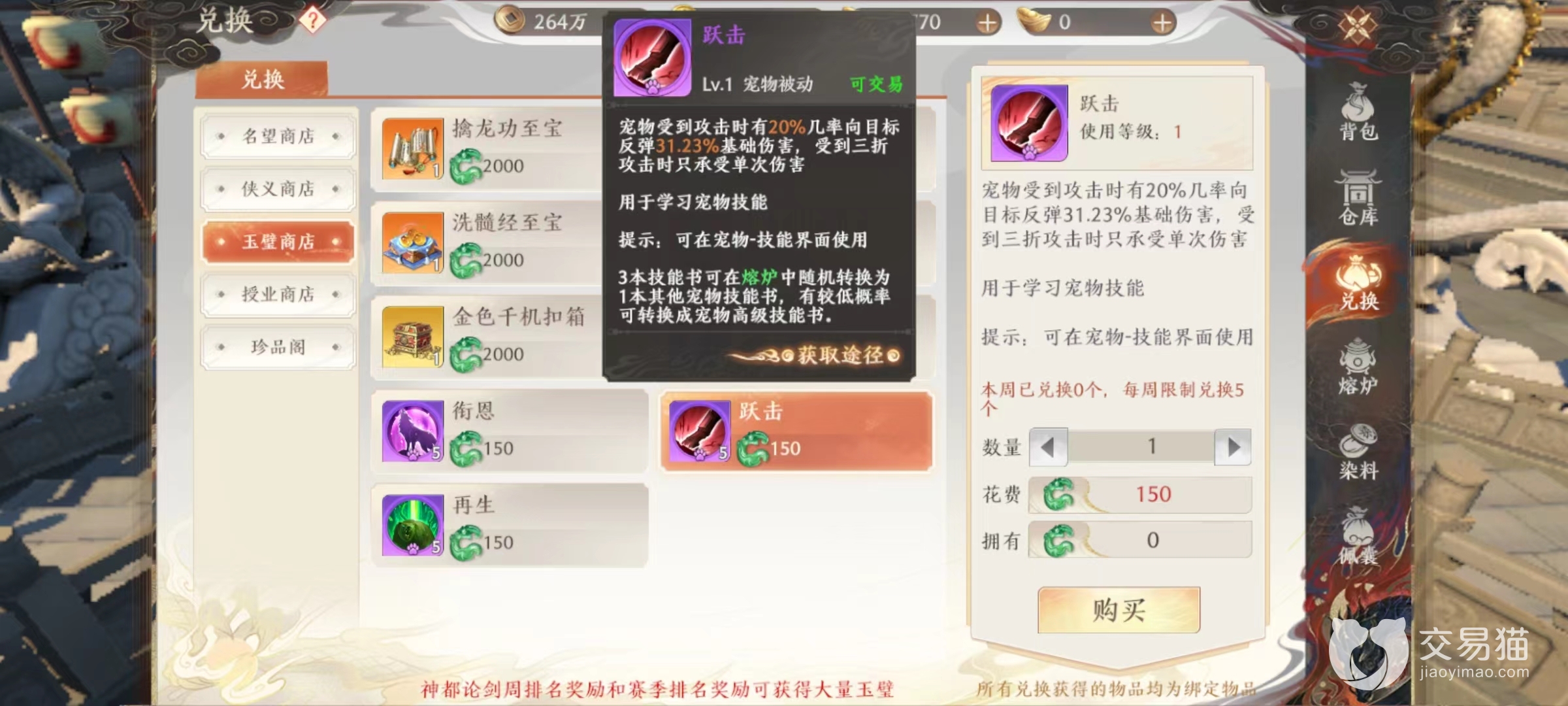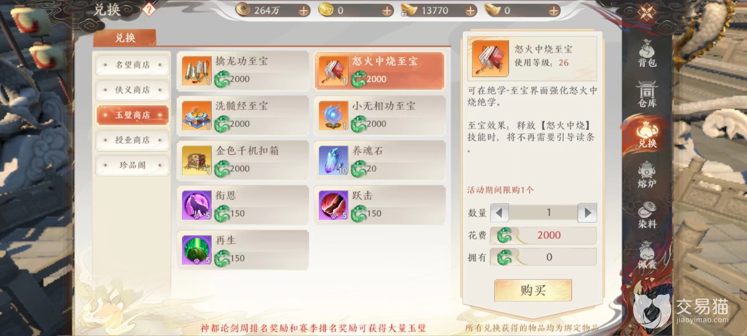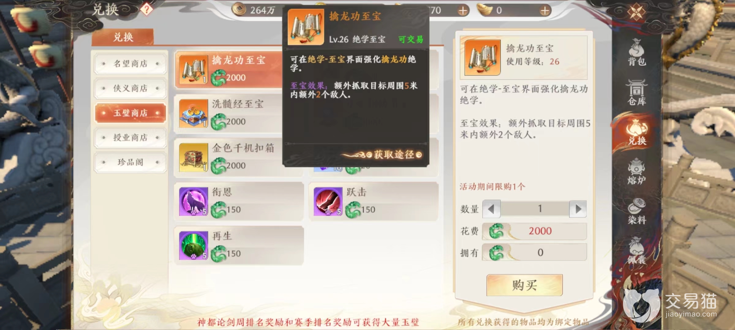 来到背包中选择玉璧商店,就能看到所能兑换内容,包括擒龙功、怒火中烧,洗髓经和小无相功这4种橙色绝学的至宝。至宝功能,编在其他攻略中已经介绍到,可以去豌豆荚专区中查看,能够极大强化绝学效果,例如擒龙功至宝就可以将更多目标抓到身前,洗髓经至宝则是在血量过低时获得护盾,都是在各自领域非常有效提升。