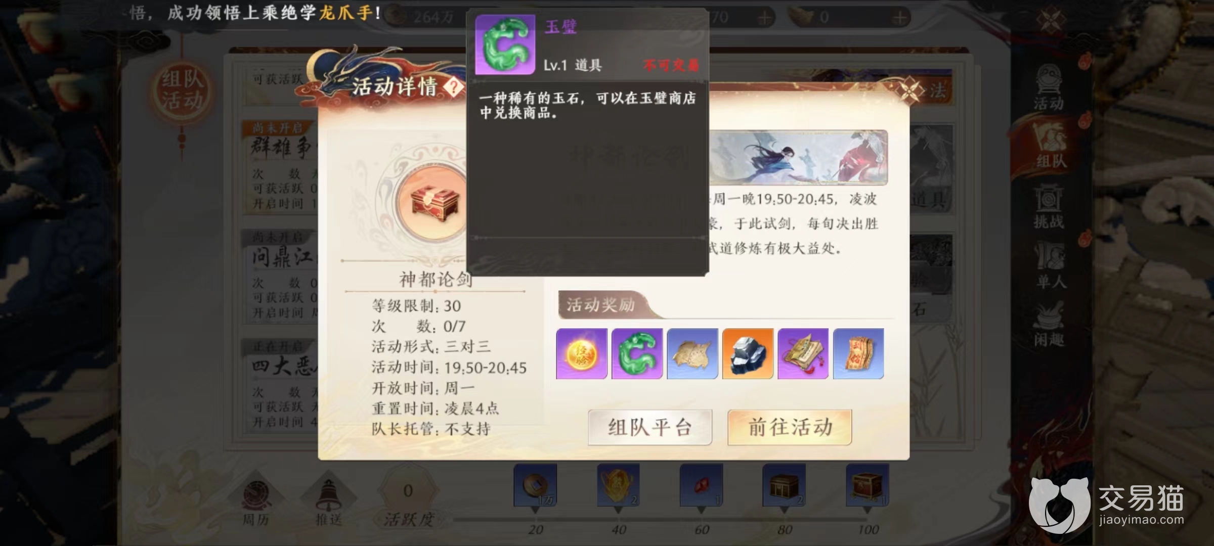 首先来看一下玉璧这项道具主要获得途径,玩家需要参加三人组队活动中的神都论剑才能获得。在开服9天之后就会开启,每周周一晚上报名参加,虽然同样是论剑PK活动,但是和华山论剑相比,神都论剑采用的是三对三形式,不仅考验玩家个人实力,也要有良好搭配和阵容组合。这些都对参战的侠客们提出了更高要求,但是在奖励上也极其丰厚。除了丰富经验和黑墨寒铁以及技能书等奖励之外,大量玉璧更是非常稀有内容。