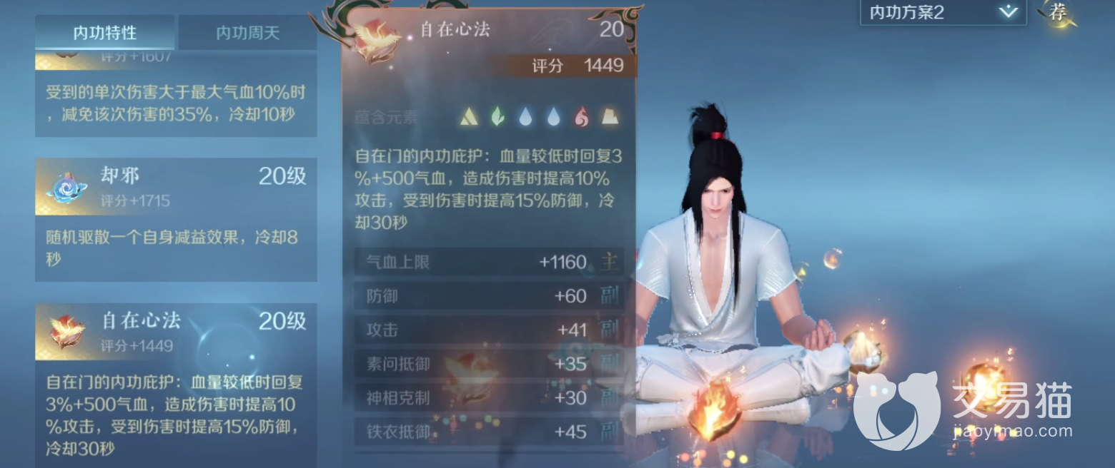 自在心法:血量较低时回复额外1%和500点血量,造成伤害时提供6%的攻击,受到伤害时提高9%的防御,三种效果共享30秒冷却。