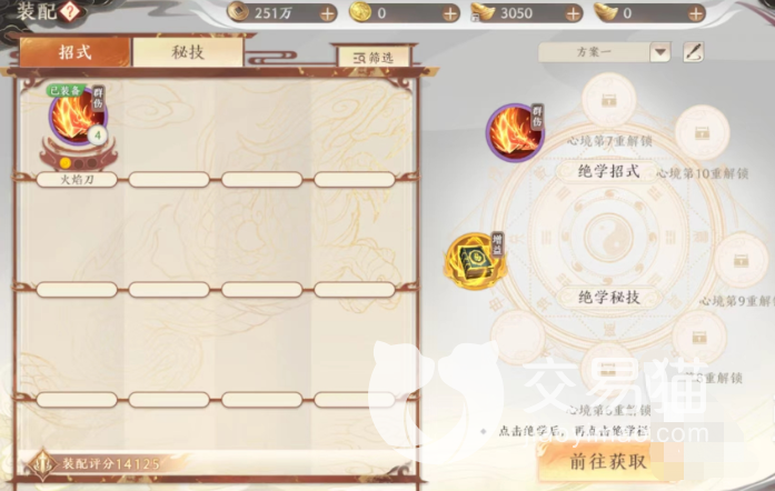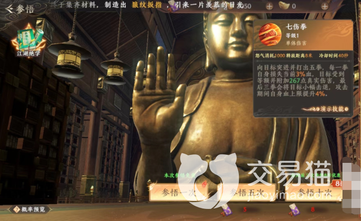 其实大家要是不知道怎么选择招式的话,是可以通过颜色来区分的,就像是装备一样,游戏中招式属性比较高的是橙色的招式,这些招式在上面其实也是比较难获取的,要是大家获取了,要记得装配哦,首先是七伤拳。