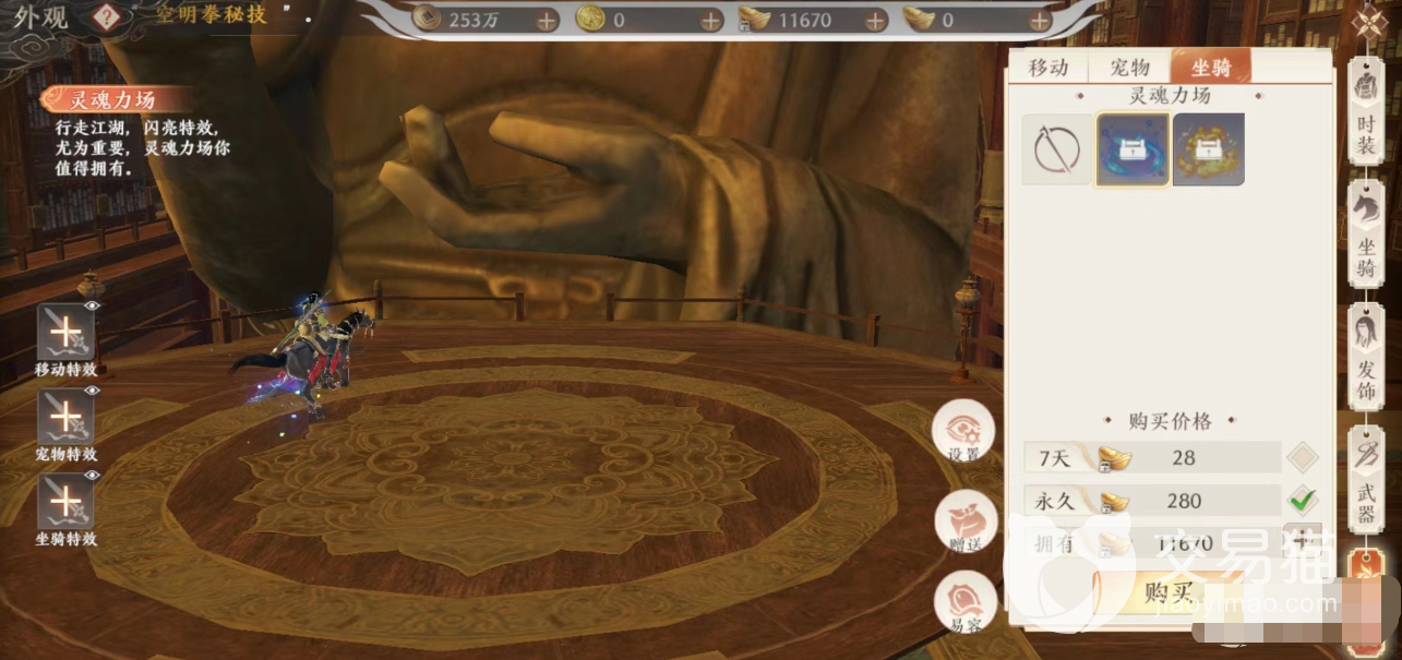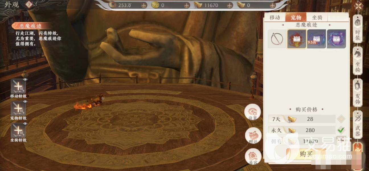 其次就是宠物的特效,宠物的特效其实也不是宠物身上的特效,反而跟移动的特效是差不多的,大家可以在上面选择一下,不过这些特效相比移动的特效更加霸气,一般这两种特效其实都是可以通过元宝来获取的,如果大家想在上面获取的话,就只能充值或者是等到做活动。