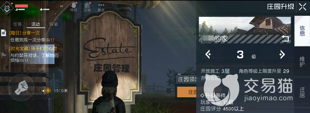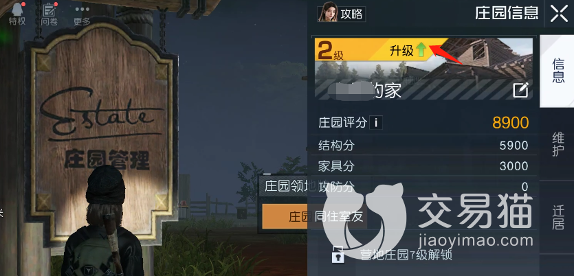 各位在自己的庄园门口区域,应该能够找到刻着庄园管理的路牌,靠近它会出现一个庄园管理选项,点击它就会出现这个庄园的详细信息,这里就会有给出各位现在庄园的等级是多少。
