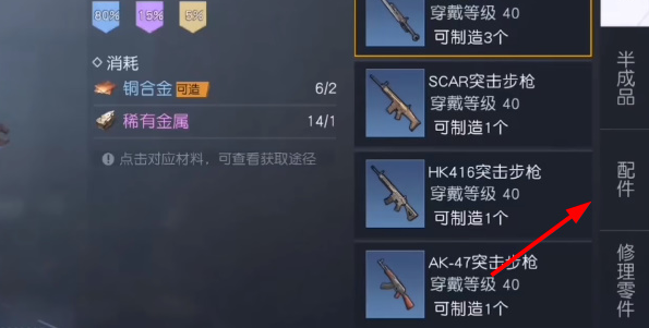 点击它之后便会出现对应所需要用到的材料是什么,如果各位缺少里面的一种材料的话,就可以点击它,然后会出现它的详情介绍,其中就会有这个东西的获取途径,而其中有些材料也是能够在武器制作台还有市场中获取到的。