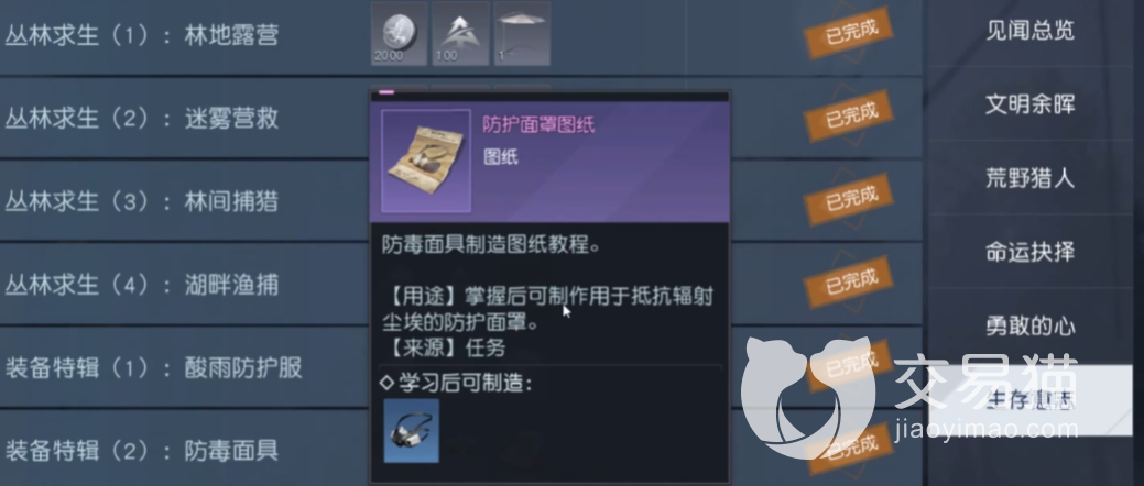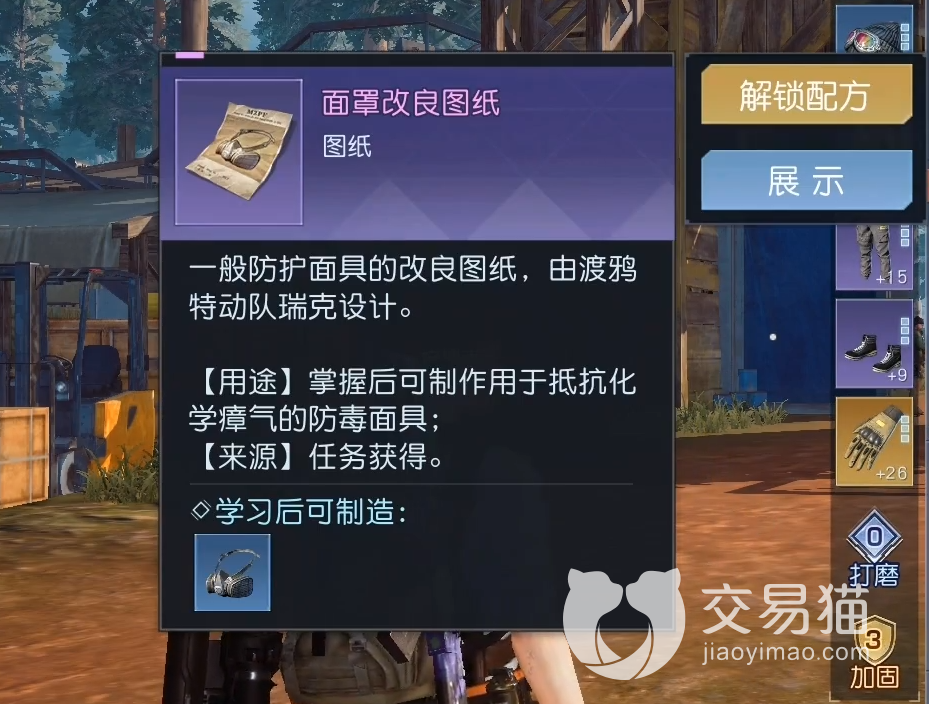 只要将这个找孩子的任务做完,那么大家就可以在对应的奖励中获取到一份图纸,而这个就是制作防毒面具的图纸,上面会详细的说明各位需要用到的材料有哪些。之后各位就是要去寻找材料了。