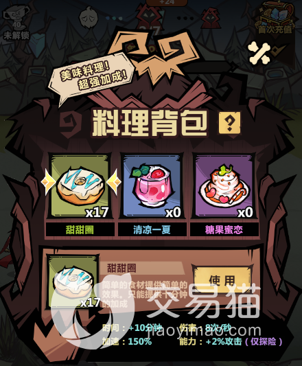 这时候我们再去看队伍就会发现它们已经在自动挂机了,这款游戏内所可以使用的料理一共有三种,分别是加10分钟挂机时间的甜甜圈和加20分钟的清凉一夏,以及加30分的糖果蜜恋。