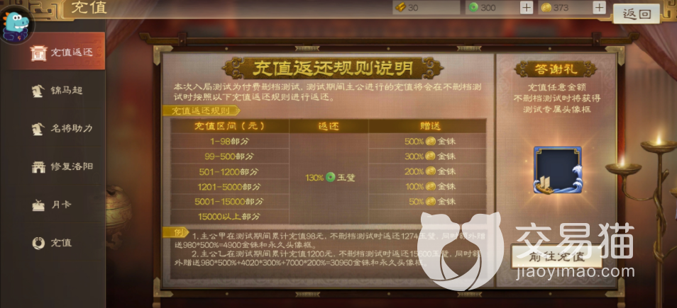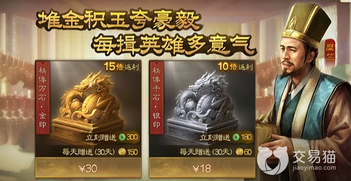 首先看懂月卡分为两个一个是金色的十五倍返利的金色玉玺,另一个是银色的十倍返利的印记,前者的价格是三十,后者是十八的价格,这两个可以一起购买,价格就是四十八的,对于游戏来说价格还算合理,也就是一天至少有一抽并且还有额外的资源买一些加速的道具。