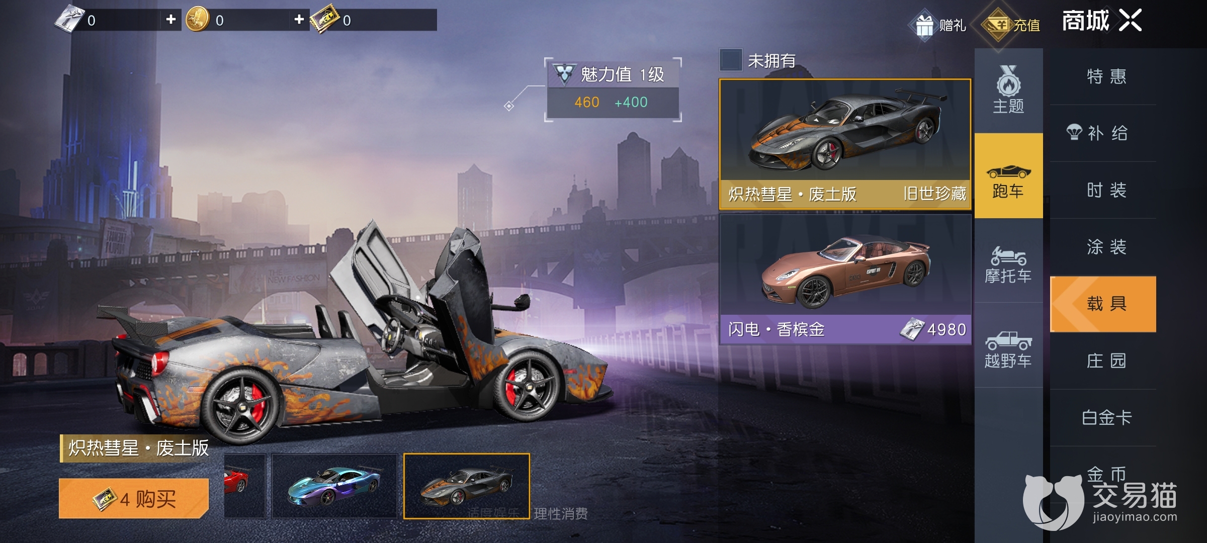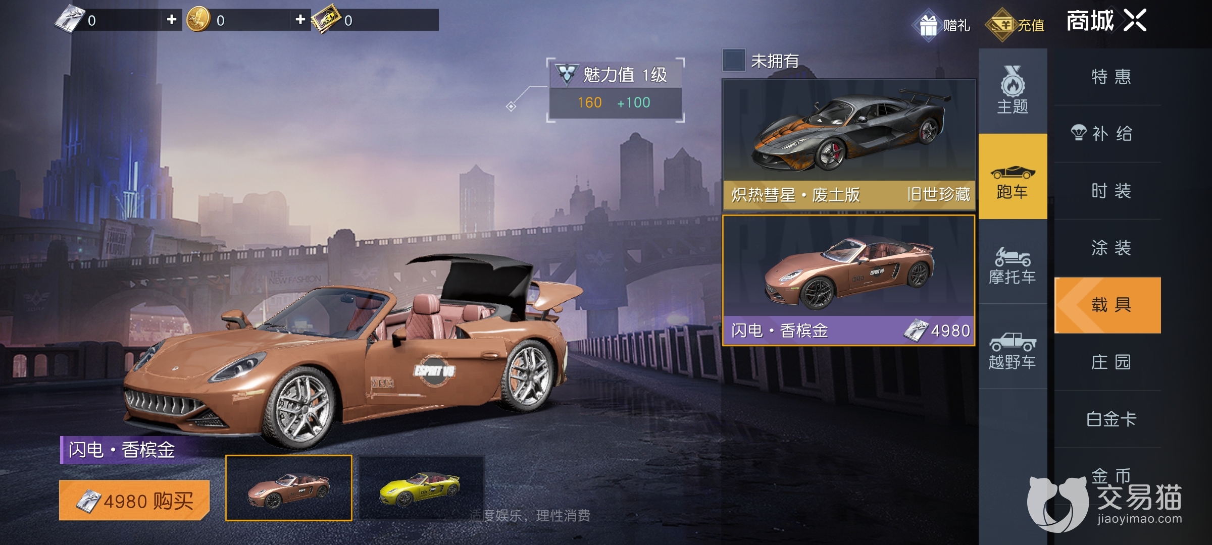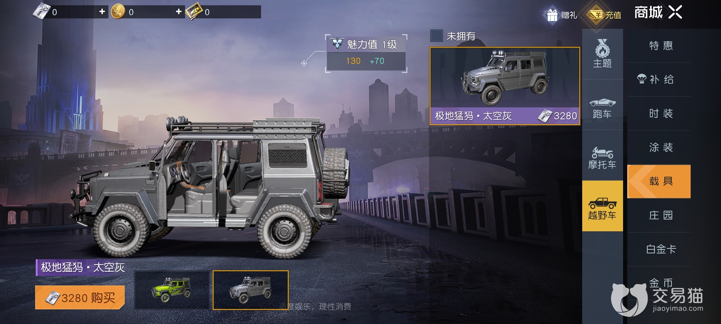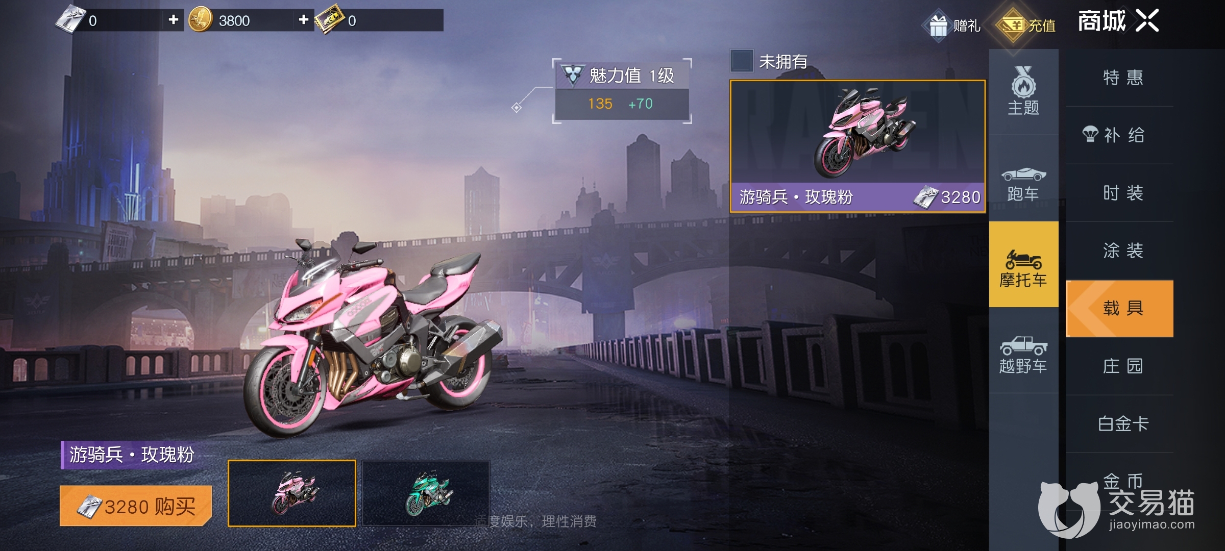 第一种是商城购买,进入游戏商城点击载具界面,可以看到目前有三款载具可以花费白金卡购买,分别是摩托车-游骑兵、跑车-闪电和越野车-极地猛犸。白金卡需要玩家充值曙光币兑换获取。