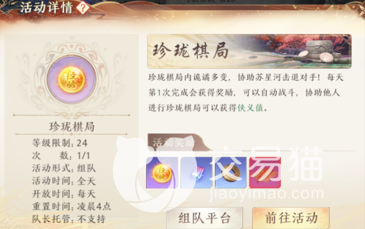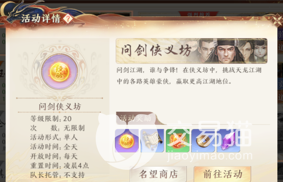 此游中还有对战类型的玩法,其中的问剑侠义坊的活动内容便是这类的,它需要各位的等级到达二十以上,单人就能够参与的,主要做的事情便是与江湖榜上的各地大侠进行对战,首次挑战就能获取胜利的话,就会获取到不少姜堰还有各类道具物品,随后挑战的等级越高,每日能够再次获取胜利的奖励就会更丰富一些。
