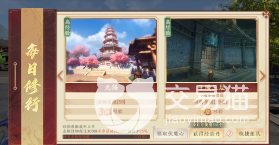 此前你是否有看到这里其实还有修行内容,各位在完成一系列的活动以后,便可以组队去可以修行的地方,那里能够领取到伏魔心以及经验丹。每日会有固定的经验值获取上限,基本各位要击败三千只怪。另外这里的经验丹每天可以获取到的数量是有限的,大家将经验刷满就够了。