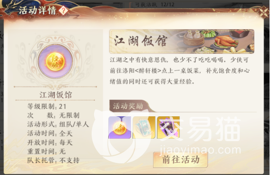 在此处有里其他获取经验的方式比较多的就是通过其他的活动玩法了,比如此处会有个江湖饭馆,讲述的是在一家饭馆里的时间,此处也是有等级限制的,需要各位达到二十一级之上才可以,不过游玩的次数是没有限制的,而且是去那天的,可以单人也可以组队进行。主要的事情就是在酒楼中点一桌饭菜,在吃饱喝足以后就可以恢复角色的心绪值,同时也能够获取到不少经验。