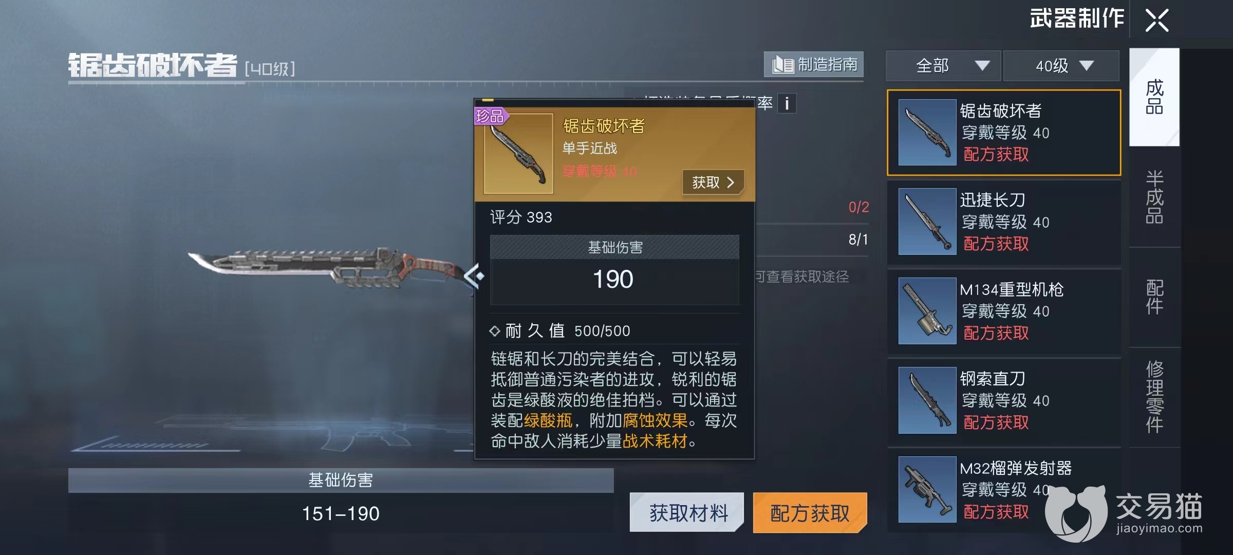 30级的近战武器只有破风长刀没有特殊加成,40级以后可以解锁锯齿破坏者和迅捷长刀,这两款武器都可以搭配技能瓶造成特殊伤害,锯齿破坏者装备绿酸瓶会附加腐蚀效果,迅捷长刀装配燃气瓶会附加燃烧效果。
