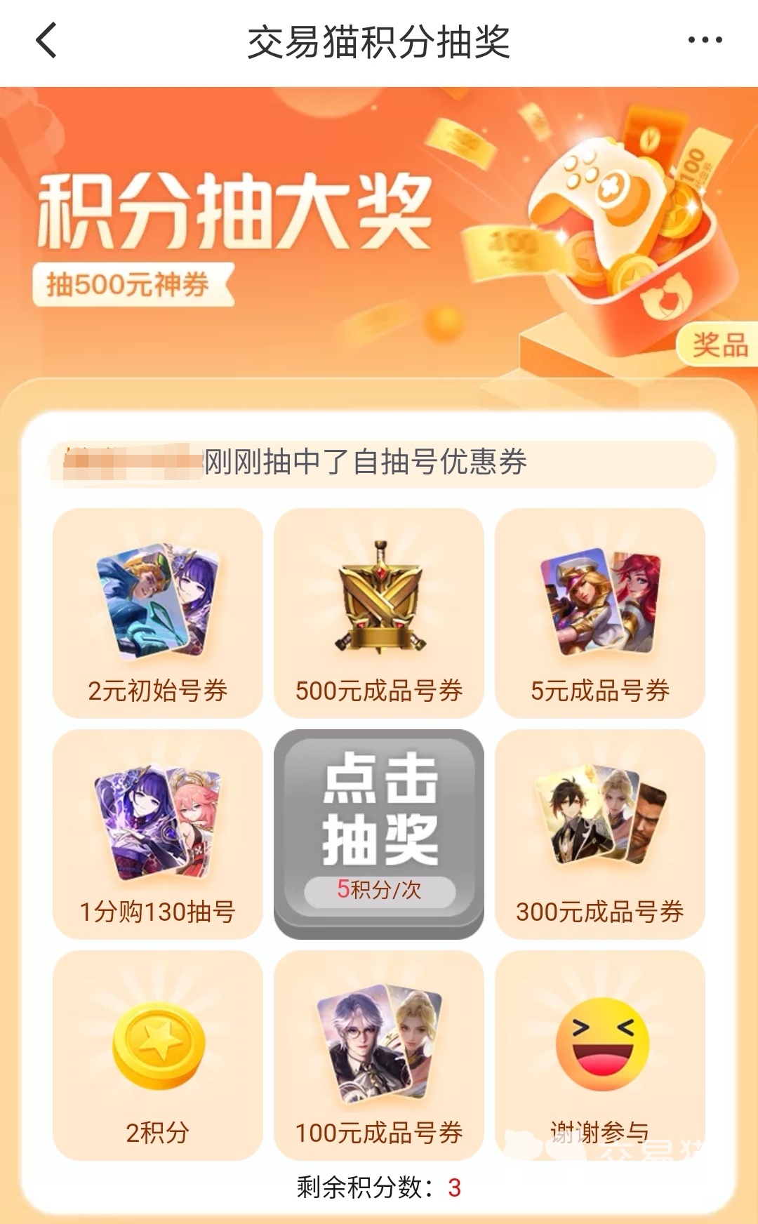 使用交易猫平台可以从每日签到领取积分。积分不仅可以在指定商品上抵扣现金使用,还可以参与积分抽奖活动,同时积分数决定了抽奖次数。玩家所持有的积分数都是公开展示的。更有初始号、成品号优惠券、大额神劵等着大家哦!