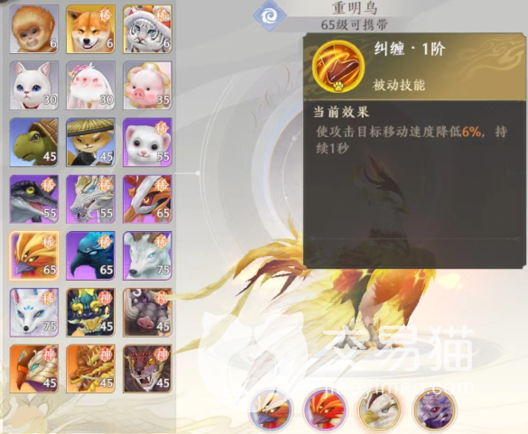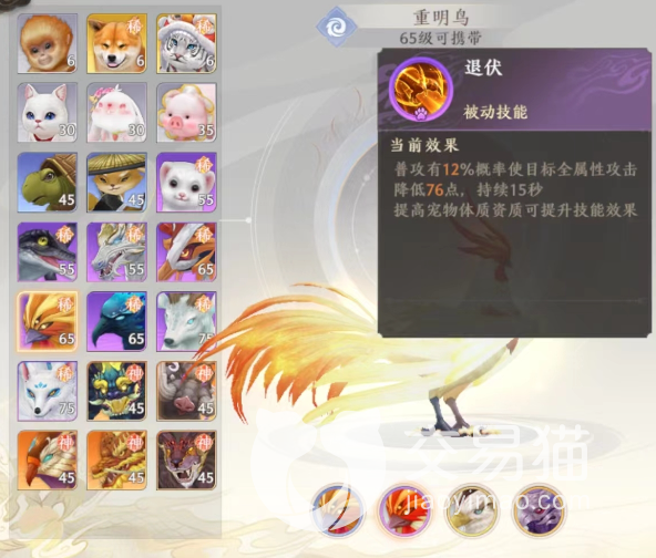 重明鸟是一个中期宠物,只有到了玩家65级之后才可以携带这个宠物,在外形上看重明鸟确实是一个不怎么吸引人的宠物,但是在变异之后其实是有强度的,它先天的技能是退伏,这个技能是在普攻上发出辅助作用的技能,在进行普攻的时候可以触发一个降低对面属性伤害的一个效果。