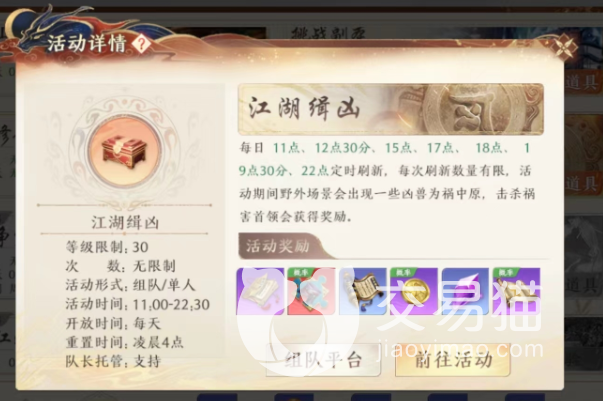 大家想要参与江湖缉凶的话,首先是需要按时间来参与,这个活动只有在固定的时间段才会开放,中午下午以及晚上都有几个时间段可以进入,大家可以在图中查看准确时间,进入中大家会发现不仅是需要跟里面的boss进行对战的。