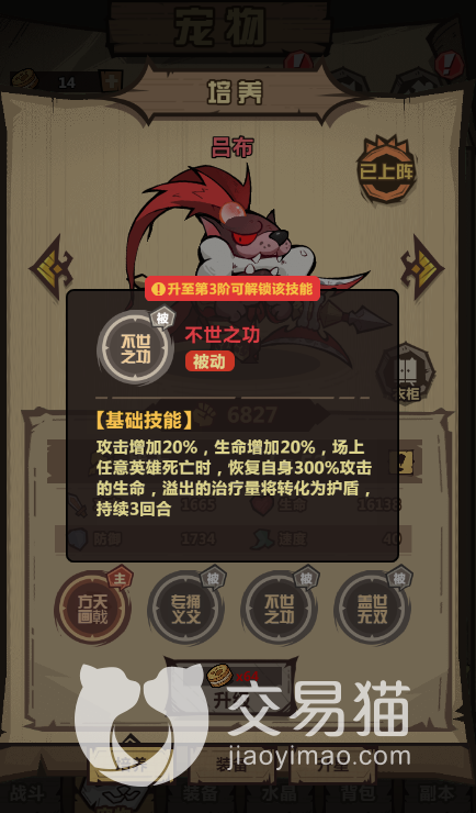说完了主动技能再来说被动技能,首先是“专捅义父”,它可以夺取敌方魂灵,普攻变成敌人前排并吸收一个自己攻击强度与目标数量的护盾,然后是“不世之功”,这个主要是为自己增加攻击力与生命值,并且如果自己队友阵亡,他都可以回复自己300%攻击的血量,如果有治疗量溢出则会成为护盾且持续3个回合。