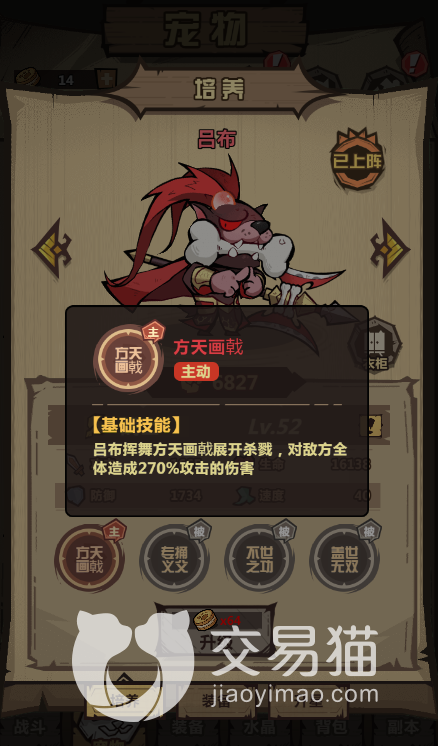 他在《王者猎人》中是一个红将,初始的数值想较与其他角色来说也是比较高的了,一共有一个主动技能和三个被动技能,下面就一个个给大家介绍一下吧,先说主动技能“方天画戟”,它可以对所有敌对目标造成高额伤害。