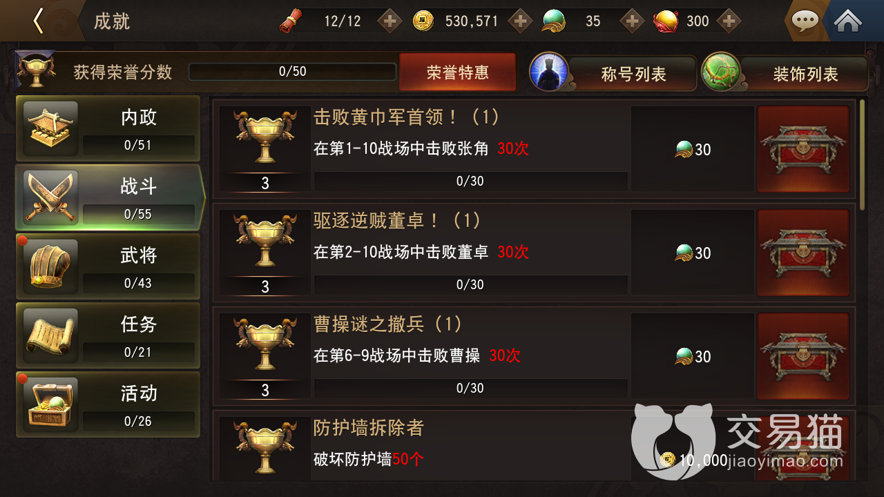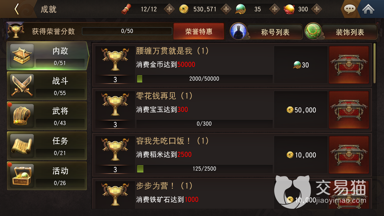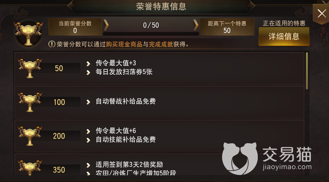 第二种方法则是完成成就,这一条途径相对来说基本就不需要什么氪金成本了,不过里面的每条成就所加的荣誉分数都比较少,所以想依靠这种途径来提升自己的荣誉特惠等级,是一个长期的工程。不过好在成就任务的类型比较丰富,其中包括内政,战斗,武将,任务和活动多种类型,喜欢经营建设的朋友就多去建设内政。