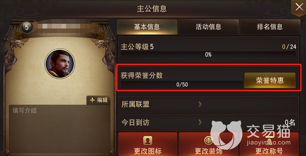 首先荣誉分数可以直接通过点击左上角头像进入主公信息面板进行查看,它里面有个荣誉特惠,这里会根据你的荣誉分数给予特惠等级,点进去后可以查看到当前的分数和特权,同时这里也会给予你获取分数的方法,目前的方法主要有两种,第一种就是购买现金商品,说白了就是氪金,大佬可以试试,平民就算了。